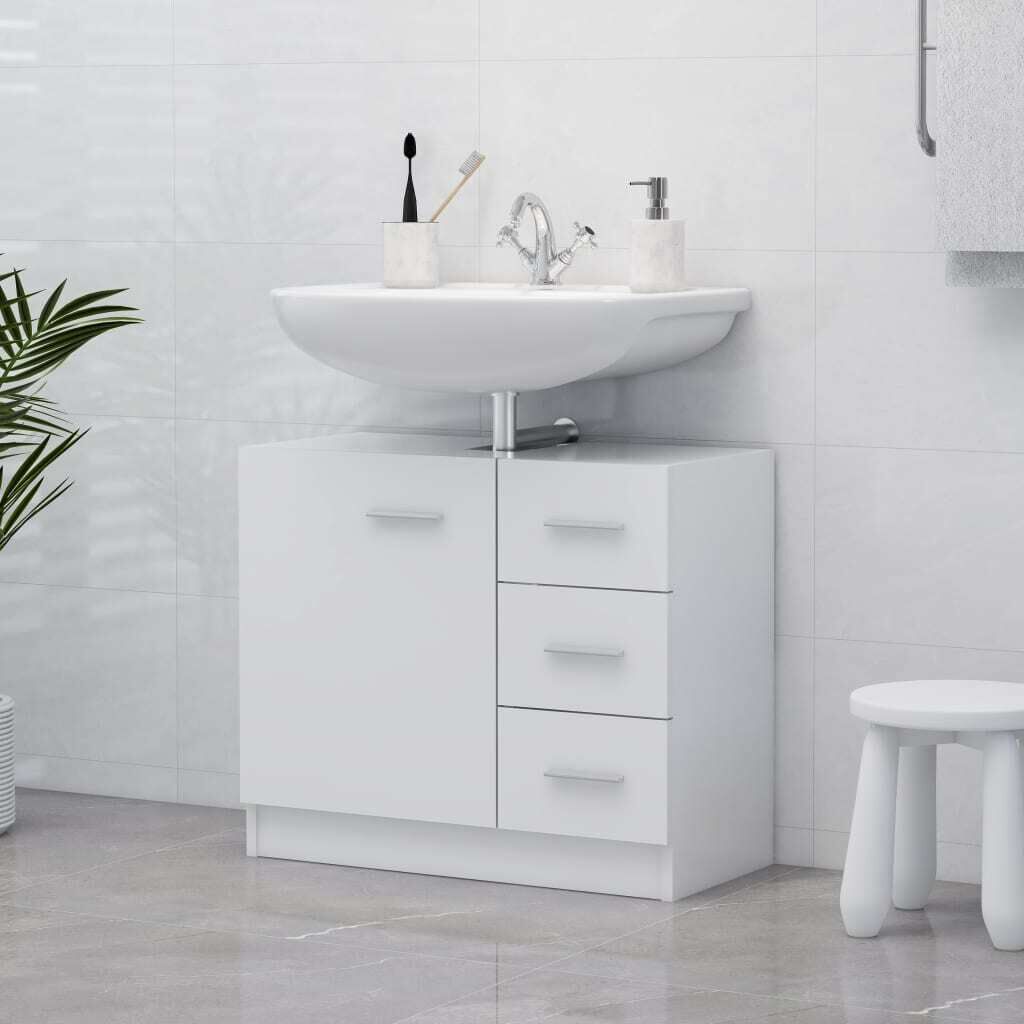 With this sink cabinet, you can create additional storage space for your bathroom with a striking, tidy appearance. The clean lines and sleek design blend into your bathroom perfectly. This cabinet is made of board, making it sturdy and stable. The storage cabinet has 1 compartment and 3 drawers, offering various storage options and extra space to store items in your bathroom. The top of the cabinet is ideal for placing the sink. Additionally, the cabinet is easy to clean with a damp cloth. Please note: The sink is not included in the delivery.