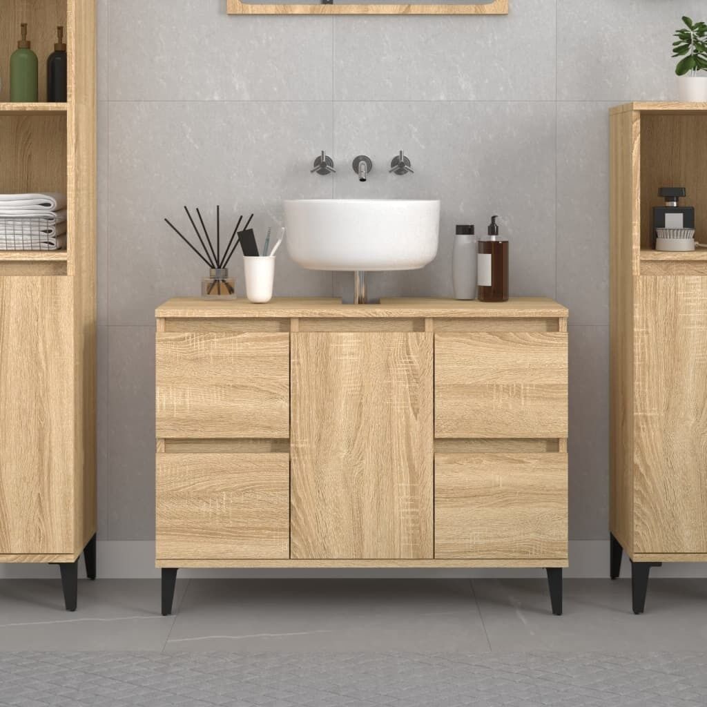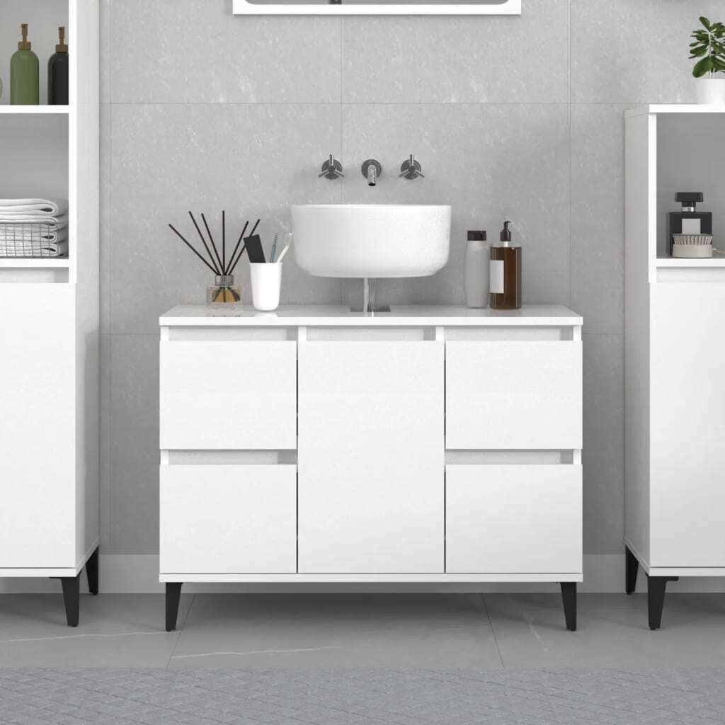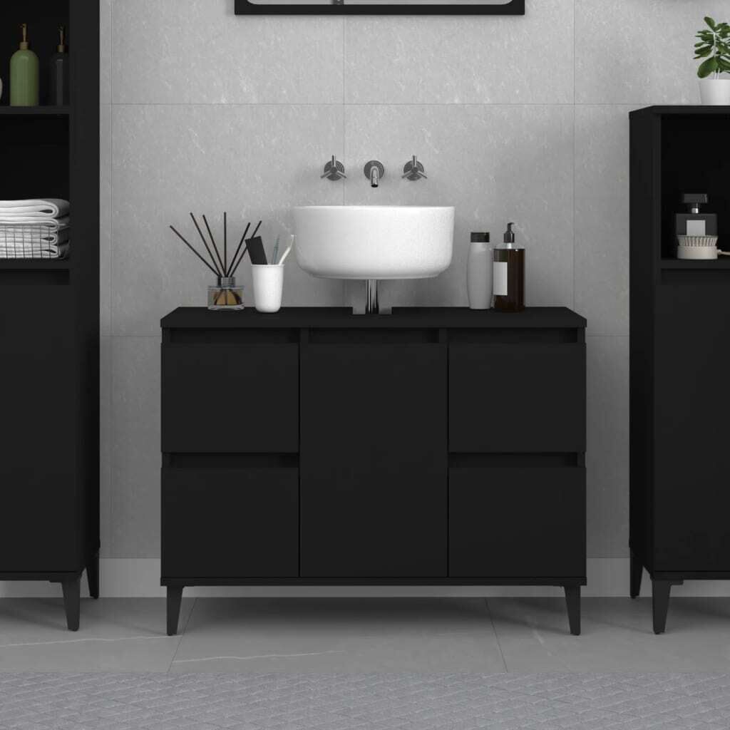 This sink cabinet is meant to be a great addition to your bathroom, giving it a tidy and striking appearance! Durable material: The engineered wood is of exceptional quality with smooth surface and also features strength, stability, and resistance to moisture.Ample storage space: The bathroom sink cabinet has 4 drawers and 1 compartment with a door, offering various storage options and extra space to store items in your bathroom. The top of the bathroom cabinet is ideal for placing the sink.Metal feet: The metal feet add a modern and calm style to your interior while ensuring stability.Easy-to-clean surface: The bathroom furniture is easy to clean with a damp cloth. Warning:To prevent it being overturned, this product must be used with the provided wall attachment device. Good to know:To make assembly as easy as possible, each product is delivered with a manual.The sink is not included.