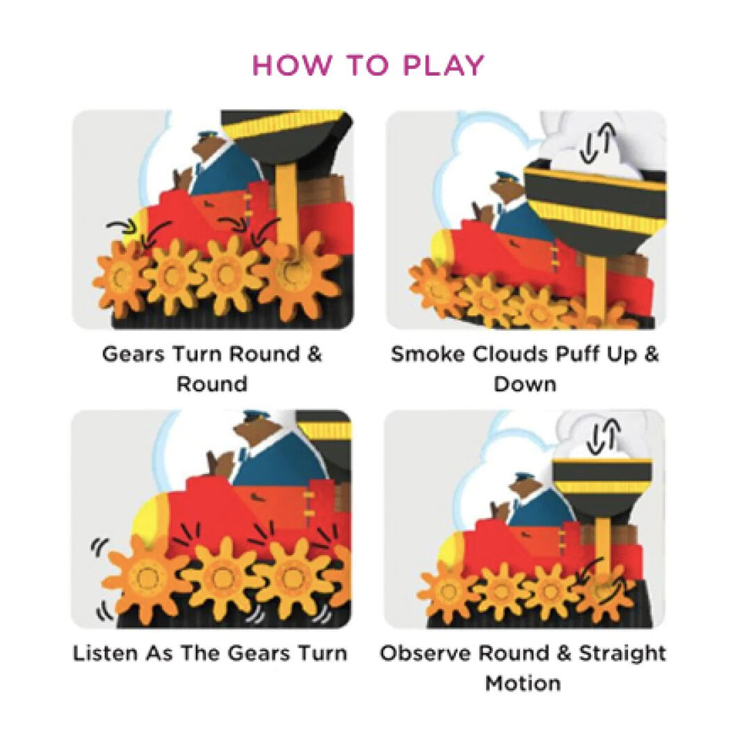 Feel the gears go click-clack as train wheels spin and entertain your little for hours!