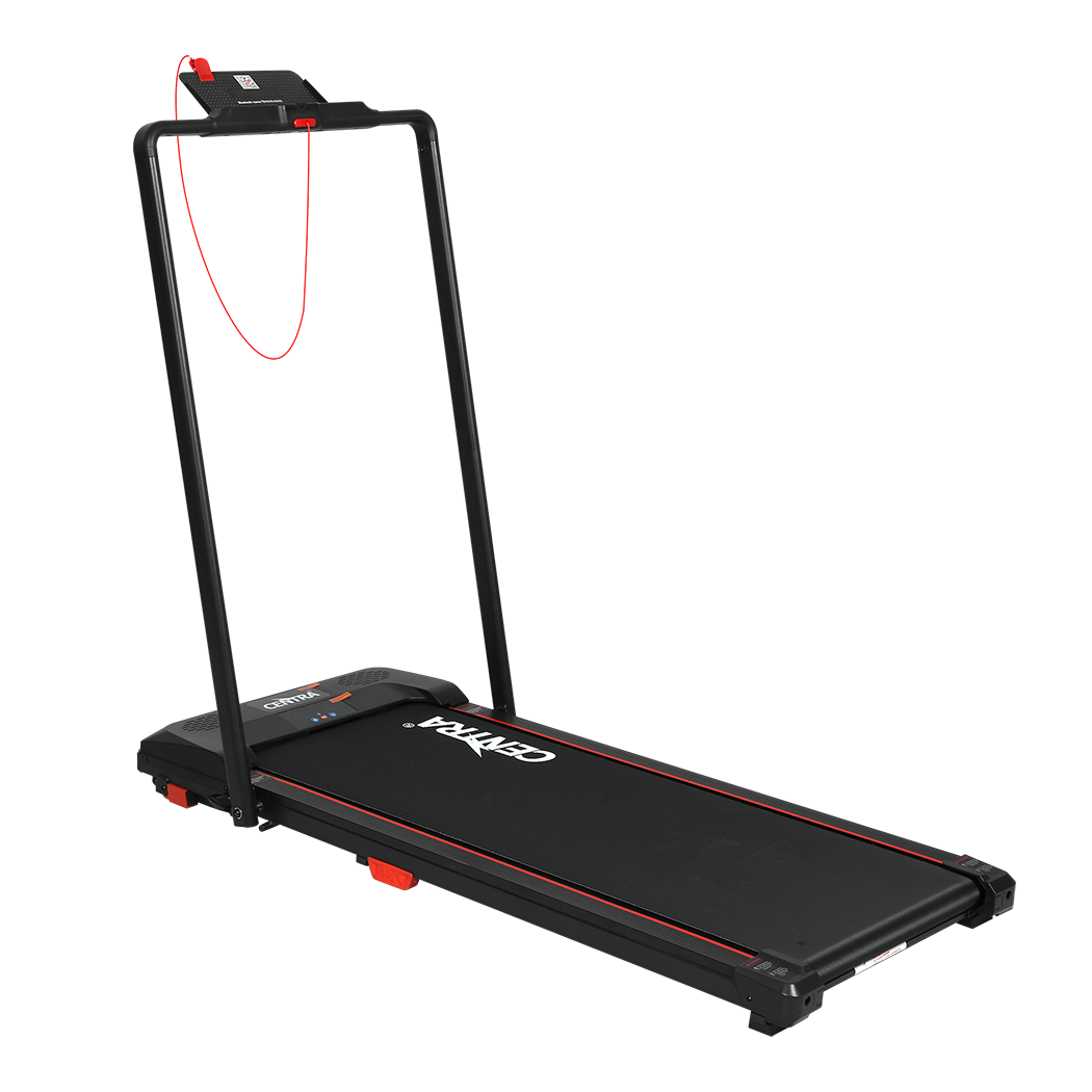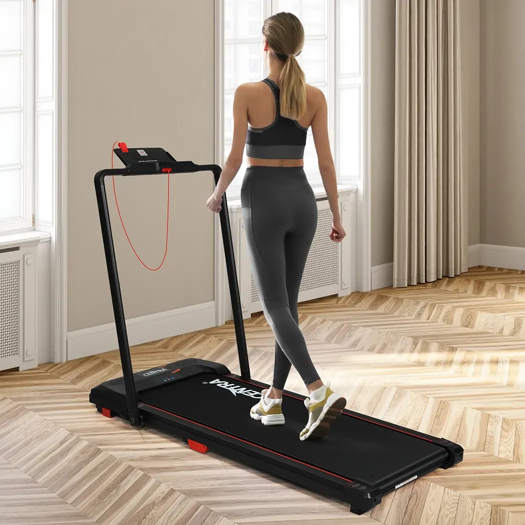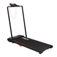 This walking mat treadmill is ideal for family exercise, its speed range is 1-12 km/h, suitable for gentle walking to intense running, to meet different fitness levels. The manual incline feature allows you to simulate uphill climbs, adding additional challenges to your daily routine. Designed with a double-layer flexible running board and silicone shock absorbers, the impact on the knee is reduced, ensuring a safer and more comfortable experience. A LED display tracks your speed, time, distance and calories, while a remote control slot ensures your remote is always safe and within reach. With a Bluetooth connection, you can make your workouts more interactive and engaging by connecting to apps like Kinomap and Zwift. This treadmill is a great addition to any home gym, providing a personalized and effective fitness experience.