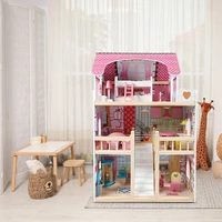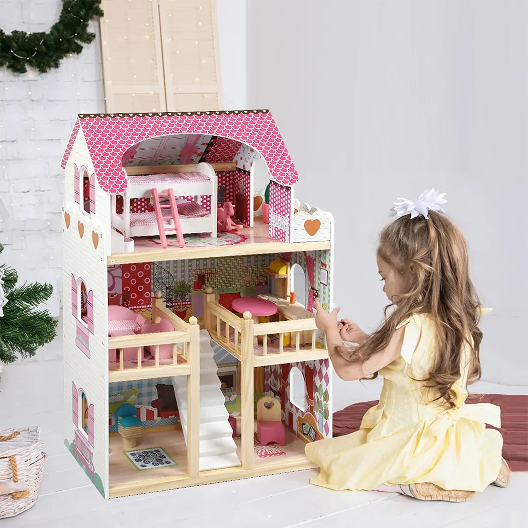 A wooden dollhouse with 3 floors lets them explore. Set up bedroom furniture on the top level. Arrange kitchen and dining room furniture on the middle floor. Lay out living room furniture on the ground floor.