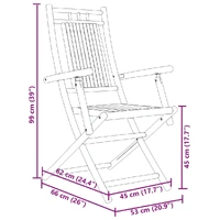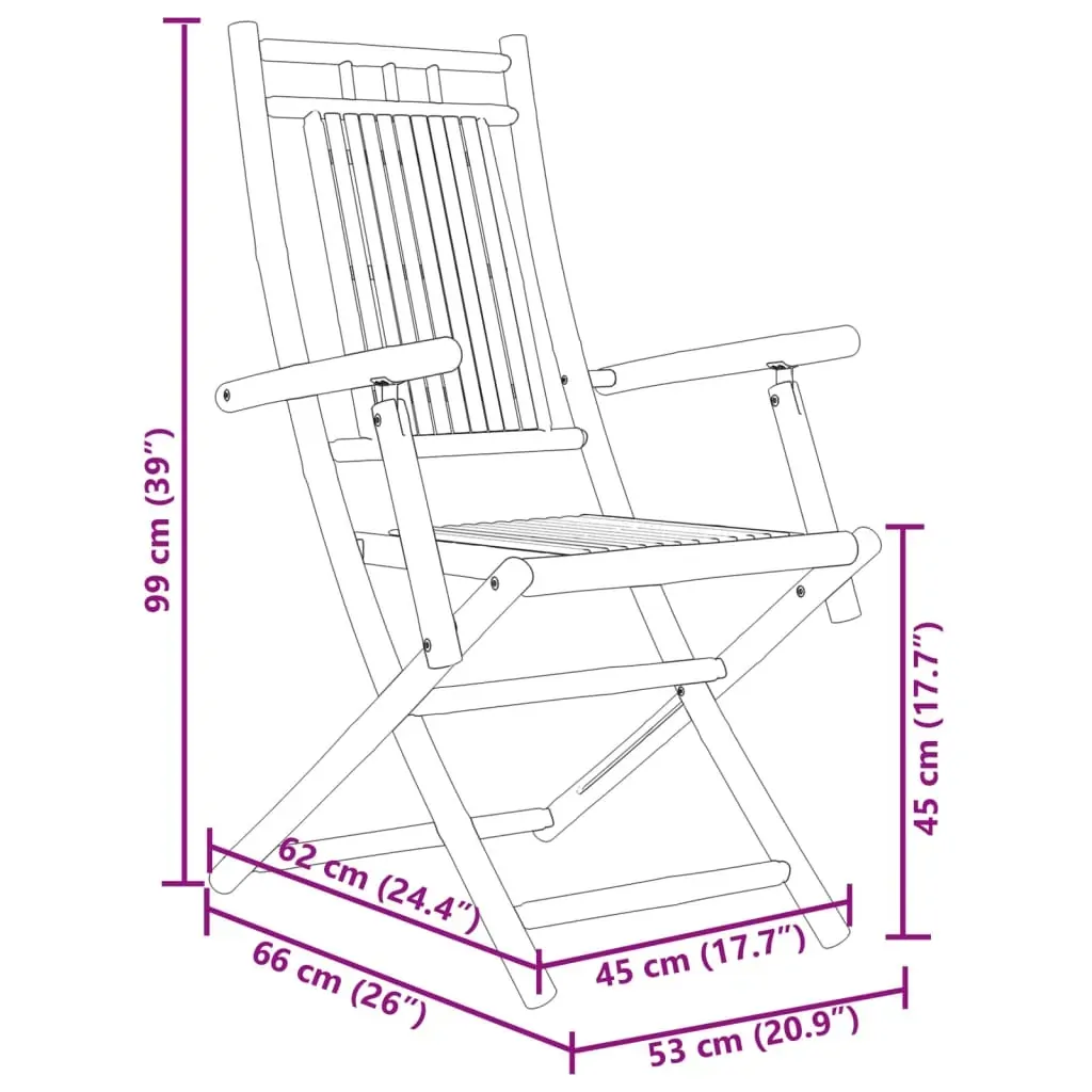These bamboo folding garden chairs have an elegant design and will be a great choice for outdoor dining in the garden or on the patio. Durable and long-lasting: As a natural material, bamboo boasts good breathability and a low odour. These qualities make the bamboo folding chair durable, water-resistant, and long-lasting.Foldable design: The dining chair can be easily folded away when not in use, for easy storage and transportation.Comfortable seating experience: Featuring armrests and a backrest, the outdoor chair gives you the utmost comfort. Good to know:To make sure your outdoor furniture stays beautiful, we recommend protecting it with a waterproof cover.