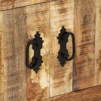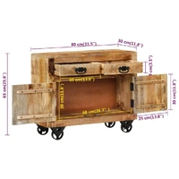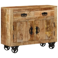 This wooden sideboard has a distinctive design and will add a touch of retro style to your interior. Solid mango wood: Solid mango wood is a strong, tropical hardwood that makes sturdy furniture. Its beautiful wood grains make every piece of furniture slightly different from the next.Cast iron wheels: The sturdy cast iron wheels make it easier to move the side cabinet. Thanks to the braking mechanism, you can easily immobilise the cabinet when it is in use.Practical design: The sideboard cabinet has drawers and a compartment which provide ample storage space for keeping clothes, books, or glassware, etc. organised, while the sturdy top is ideal for displaying decorative items, like vases, photo albums, fruit baskets, etc. Good to know:Colours and grains vary per furniture item, making each piece unique. The delivery is random, ensuring the exclusivity and individuality of your product.