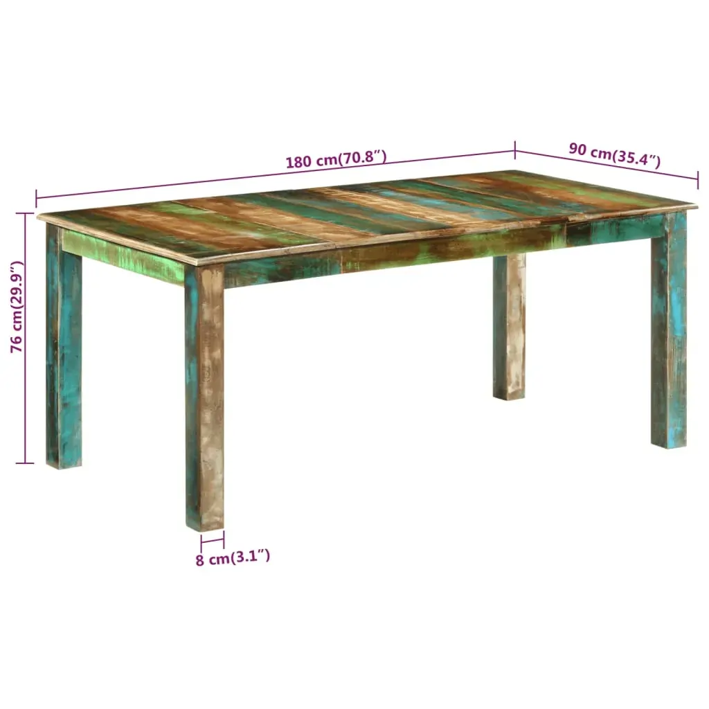 This wooden dining table features a vintage charm that will make it a distinctive addition to your living space. Solid reclaimed wood: Solid reclaimed wood consists of reused timbers such as teak, mango wood, pinewood, and beech. These materials are recycled from old buildings such as factories, sheds, and boats. As every piece is handmade, colours will vary for each product.Easy cleaning: This table top is easy to clean with a damp cloth.Practical tabletop: The sturdy tabletop of the kitchen table is perfect for placing meals, drinks, and other decorative items. Warning:To prevent it being overturned, this product must be used with the provided wall attachment device.Note:The colours may vary from piece to piece, making each piece unique and slightly different from the next. The delivery is random, ensuring the exclusivity and individuality of your product.