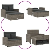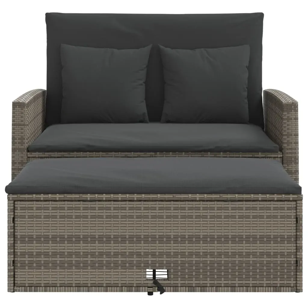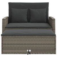 Relax and enjoy the outdoors in this comfortable 2-seater garden sofa! Durable material: PE rattan, also known as poly rattan, is a strong, low-maintenance synthetic material that looks like natural rattan. It's lightweight, easy to clean, and commonly used for outdoor furniture due to its durability and weather-resistant properties. Versatile functionality: This outdoor furniture can be used as a 2-seater bench or a sofa bed. You can easily switch it to a bed by reclining the backrest and pulling out the stool from under the bench. The support panels behind the backrests make the bed more stable. Versatile footstool: The outdoor footstool can be used to sit or relax your feet, and can also be used as a coffee table to hold drinks, food, and other decorations. In addition, the footstool has a storage function to store cushions and pillows and can be neatly tucked underneath the sofa to save space. Comfortable seat experience: This outdoor furniture, complete with thickly padded cushions, offers a comfortable seating experience. Removable and washable cover: These seat cushions feature removable covers for easy washing and maintenance. Good to know:To make sure your outdoor furniture stays beautiful, we recommend protecting it with a waterproof cover.