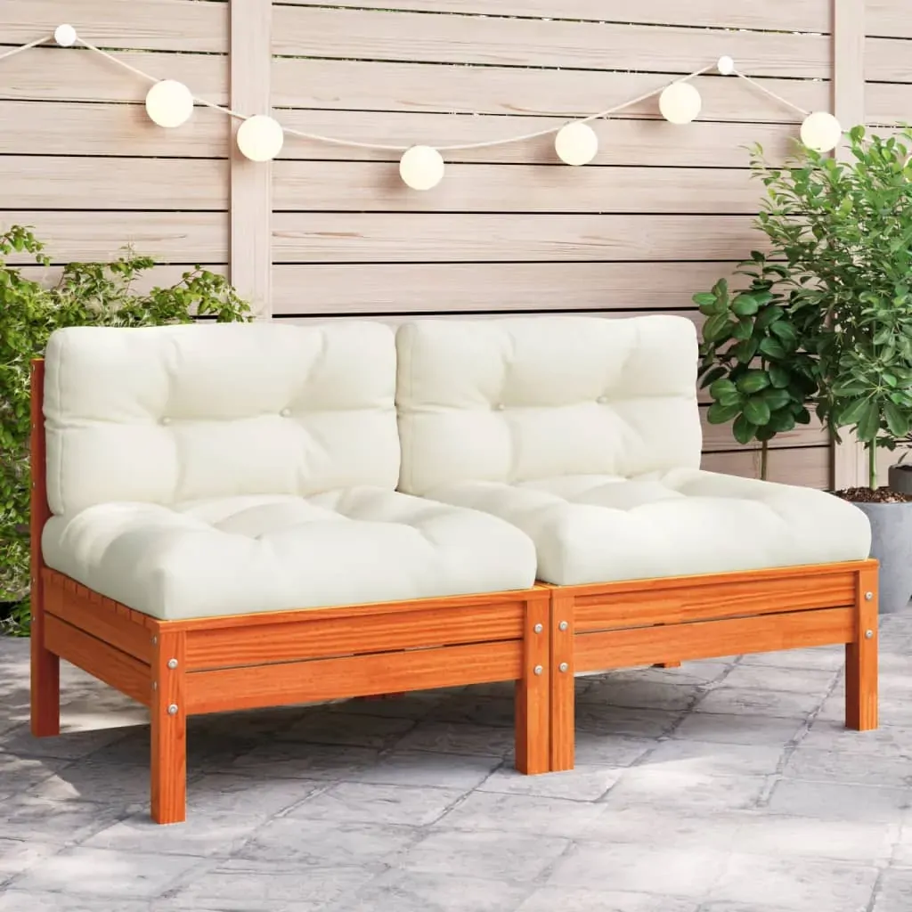 This wooden garden sofa with cushions will make a great addition to your garden, terrace, or patio for chatting with family and friends or just enjoying the weather. Solid pine wood: Solid pine wood is a beautiful natural material. Pine wood has a straight grain, and the knots give the material its signature, rustic look. Made of solid pinewood, this armless sofa is durable and stable.Comfortable seat experience: The backrest and the thickly-padded cushions make the garden sofa chair more comfortable to sit on.Slatted design: The slatted design of the outdoor sofa effectively prevents water from pooling, ensuring that the seat remains dry and free from potential rot.Modular design: This single sofa features a modular design, making it completely flexible and easy to move around to suit any setting. You can combine it with other modular segments available in the drop-down menu to create your own personal garden lounge set configurations! Good to know:To make sure your outdoor furniture stays beautiful, we recommend protecting it with a waterproof cover.