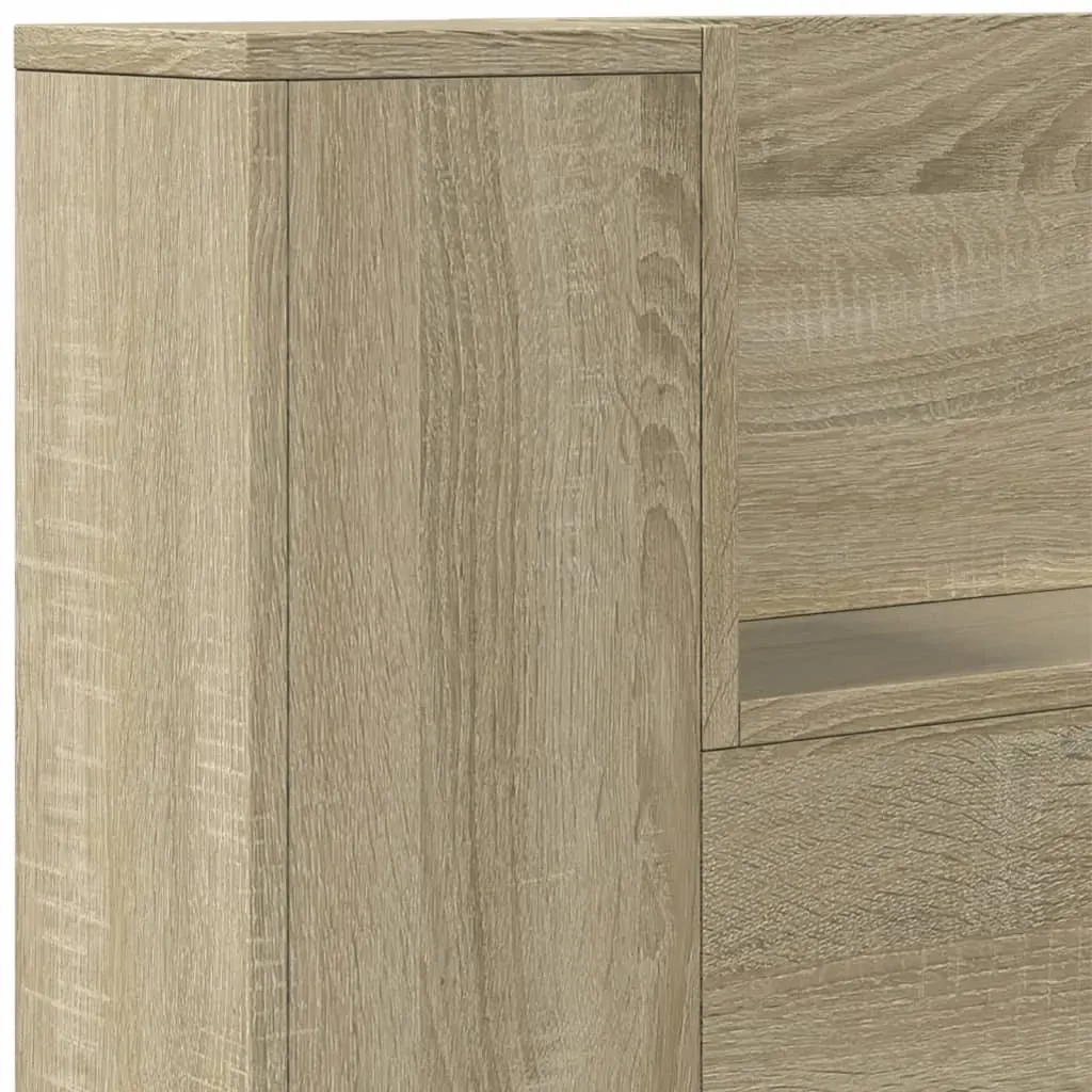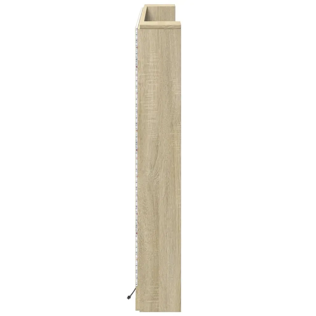 This headboard cabinet with LED, featuring a stylish design, gives your bed frame a stunning modern touch and is perfectly suitable in any bedroom. Durable material: The engineered wood is of exceptional quality with smooth surface and also features strength, stability and resistance to moisture.RGB LED lights: The bed headboard is equipped with vibrant RGB LED lights. With various customisable menus, you can effortlessly change the colour of the lights and even set them to adjust automatically. These LED lights not only enhance the contemporary look of the bed header but also add to its trendy appeal.Ample storage space: Featuring an open shelf, the bed headboard cabinet is perfect for displaying your books, decorative items, picture frames and alarm clocks.Excellent support: The headboard for bed provides you with excellent back support when you sit up in bed to read or watch TV. Good to know:The delivery includes LED headboard only. The bed frame and mattress are not included. You can check our shop for the matching frames and mattresses.The product has a USB connector that requires a certified 5V USB power source (not included). Warning:To prevent it from tipping over, this product must be used with the provided wall attachment device.