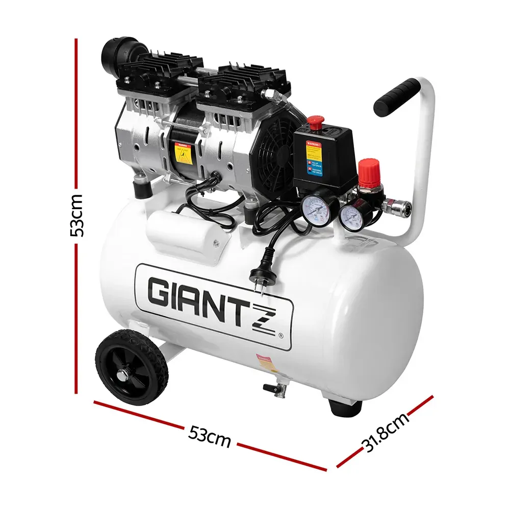 For light vehicle repairs and regular air tool operation, the Giantz Air Compressor is your go-to product. This 24L compressor boasts a pressure of 115psi, ensuring powerful performance for a wide range of applications including tire inflation, spray painting and woodwork. With its oilless lubrication system, you can say goodbye to messy maintenance. The smart and easy snap-on air outlet allows for quick and hassle-free connections. It features auto-reset thermal protection and power overload protection for total safety. Plus, its ultra-quiet operation won't disturb your work environment. Easy to move around, the Giantz Air Compressor is great for any project no matter how small.
