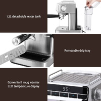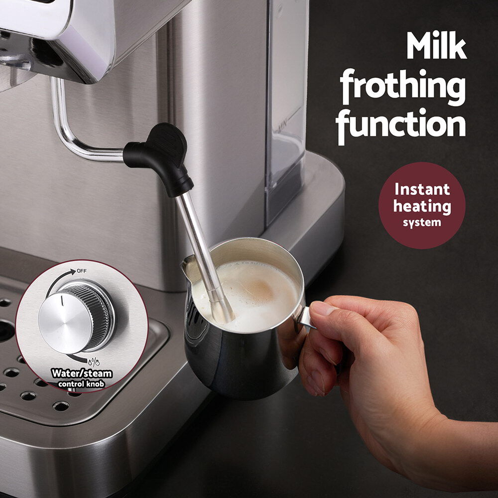 Get a head start on the day with your first cup of coffee from a Devanti Espresso Machine. Pour the perfect shot every time with easy-to-use controls, a powerful 20-bar pressure pump, and an instant heat system. The machine comes with single and double-shot coffee filters, a diecast aluminium portafilter and a dual coffee tamper/spoon - everything you need for a fresh cup. The convenient mug warmer keeps your cups at the perfect temperature as you froth your milk just the way you like it. Easily fill the machine from the removable water tank and clean it up with the removable drip tray. Its space-saving design means it won't take up your entire benchtop, giving you plenty of room for your other kitchen essentials. Relax and enjoy your favourite coffee from the comfort of your home with your very own Devanti Espresso Machine.