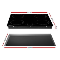 Whether it is for your existing or new home, the Devanti 70cm Induction Cooktop is just the thing you need for easy, no-fuss cooking. Loaded with an extensive list of chef-friendly features such as four high-wattage cooking zones, touch control and LED display panel, independent 99-min timers, overheat protection and efficient heat dissipation, this cooktop is also incredibly sleek with its high-grade black ceramic glass plate. It features nine power levels to choose from to prepare that perfect dish. Plus, the residual heat indicator also helps to tell when it is safe to touch the cooktop after turning the hot plates off, and a child safety lock prevents accidental usage. Better still, the cooktop will turn itself off when temperatures get excessively high, or you simply forget to turn it off after your cooking. Powerful and yet integrally safe, the cooktop promises many moments of hassle-free delicious cooking with the right blend of sophistication and class for your kitchen.