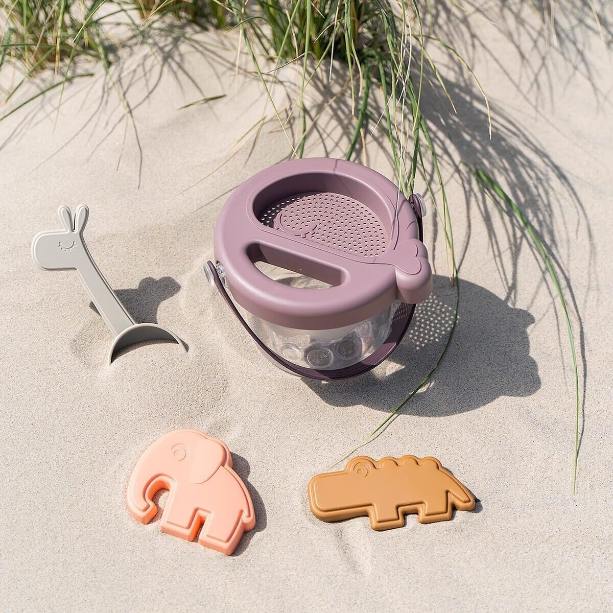 Featuring Croco and Elphee moulds, a Raffi shovel, and a clear bucket with lid, the set can be used at the beach, sandpit or for sensory water-play.