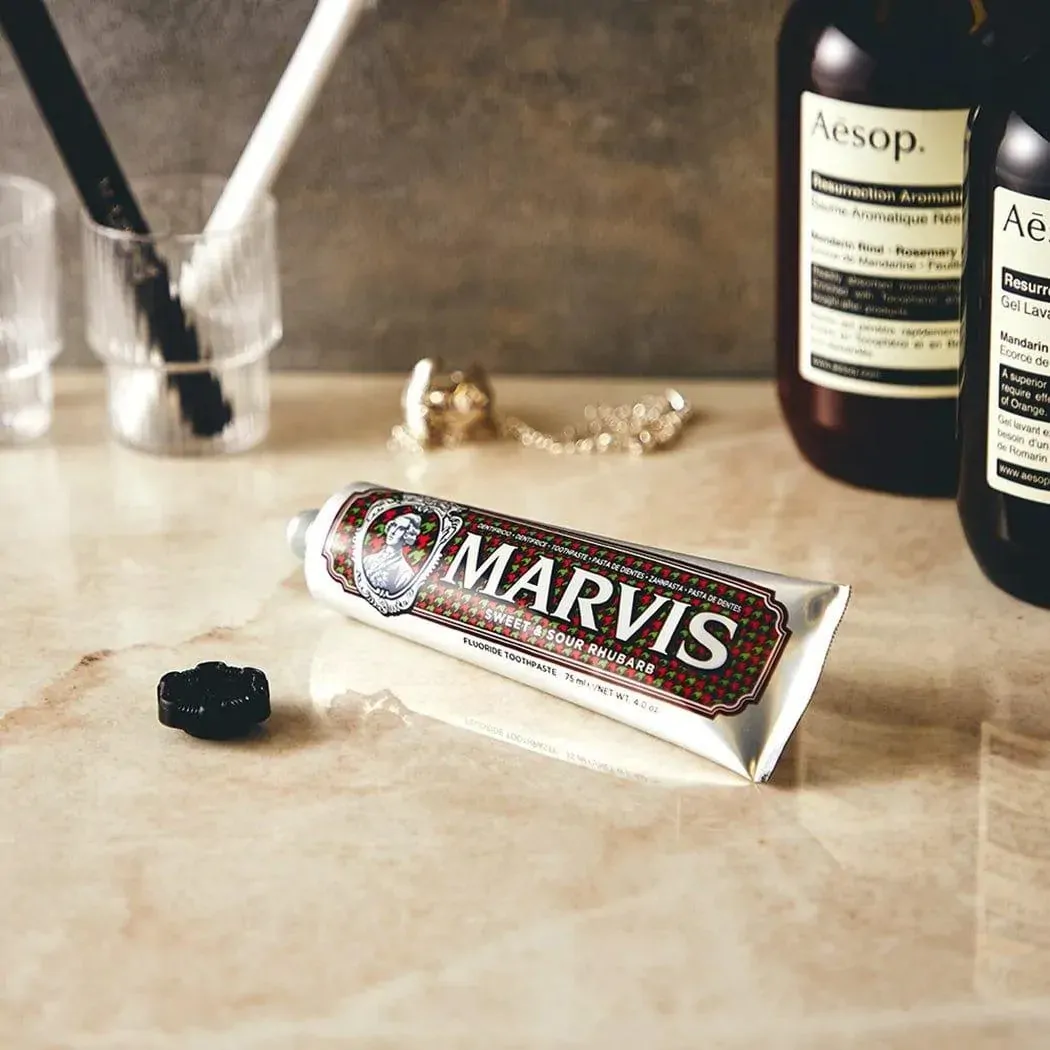 An unquestionably stylish and quality choice for your oral health and bathroom shelf, Marvis toothpastes give a long lasting pleasurable taste sensation. Daily use helps prevent tooth decay, fight tartar and plaque and keep breath fresh. Rich, dense and creamy in texture, Marvis's Sweet and Sour Rhubarb is combined with the usual Marvis mint base... delicious!A fantastic fusion flavours of fresh mint and the sour aromatic notes of rhubarb