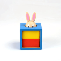 Is the rabbit looking through the round hole or through the star-shaped one? Is it standing on top of the yellow, the red or the blue block?