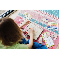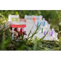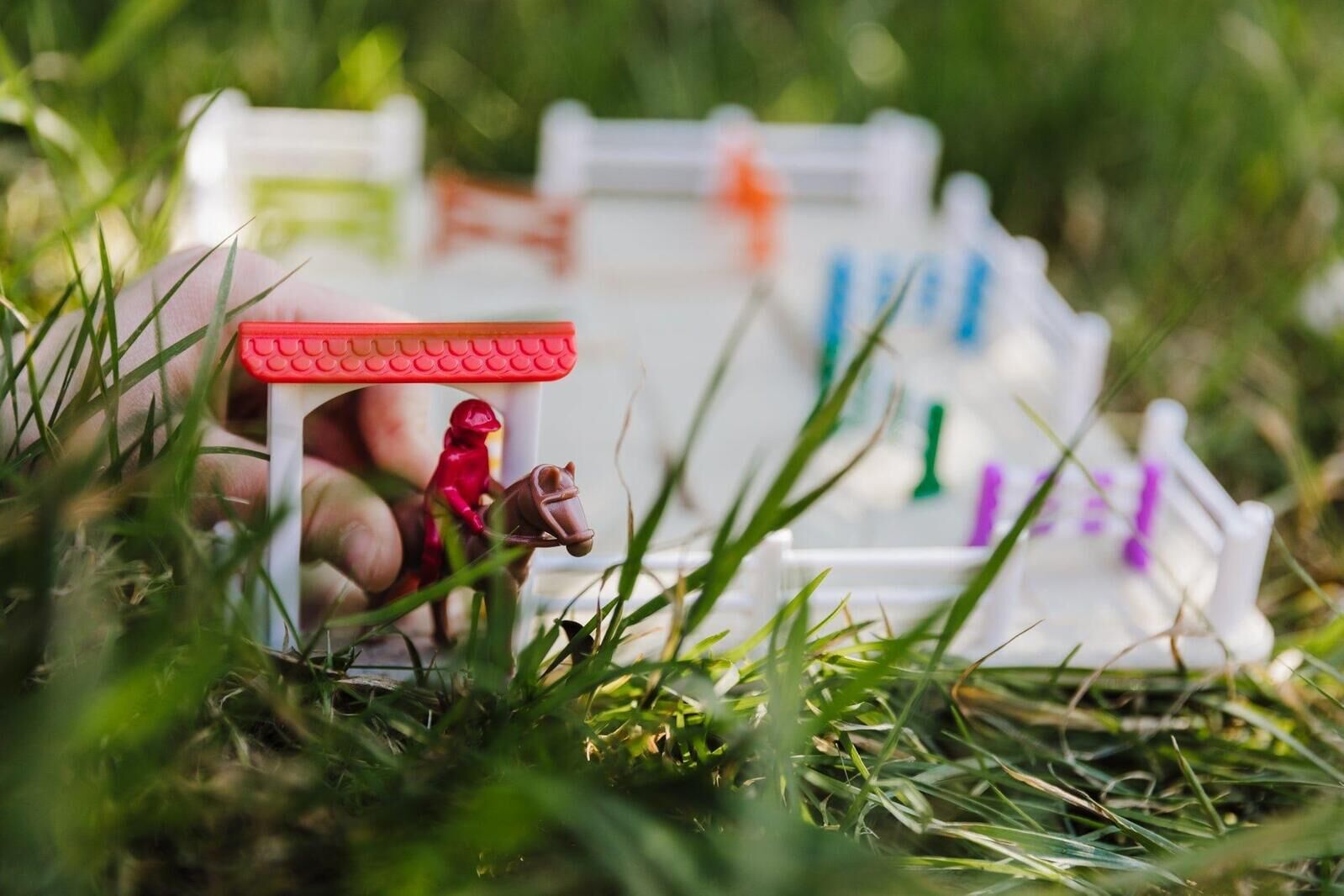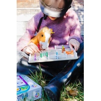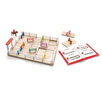 1 game board, 1 exit gate, 10 puzzle pieces with obstacles and paths, 1 horse with rider, booklet with 80 challenges