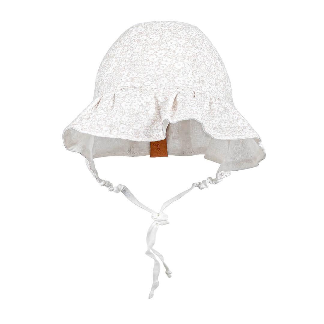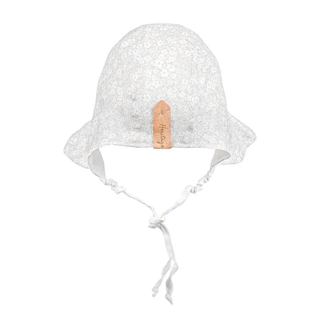 The simplest, subtlest pattern around ? so-sweet tiny white flowers on the softest greige colour around. A reverse of pure white keeps this hat light and bright and able to go with anything. Willow is available in Ruffle Bonnet, Flap Hat, Panelled Bucket and Wide-Brim Bucket.