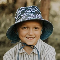 Got the blues? Not in this print! Scout pairs the deepest navy with our beautiful Steele colour and a splash of white and grey for this unique arrow print. That most perfect blue-grey Steele is the reverse. Scout is available in Baby Flap Hat and Classic Bucket.