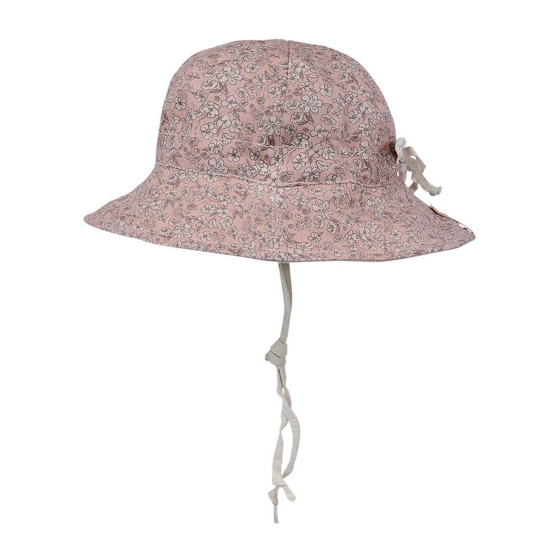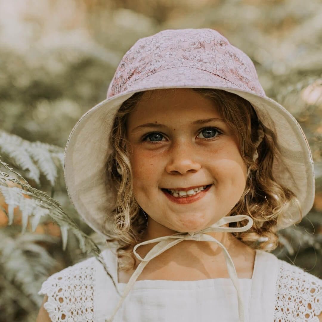 Simple beige blooms on a dusky pink background, Florence is a great girlie neutral. The beautiful stone colour of Flax on the reverse means it will go with alllll the outfits. Florence is available in Flap Hat, Bonnet, Panelled Bucket and Ladies Sun Hat.