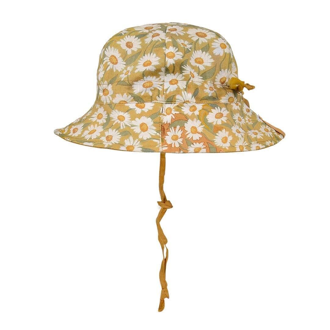 White daisies on a golden background with olive leaves? the perfect summery combo for all the sunshine feels. Reverse the hat for a solid yellow Maize colour. Maggie is available in Bonnet, Panelled Bucket and Ladies Sun Hat.