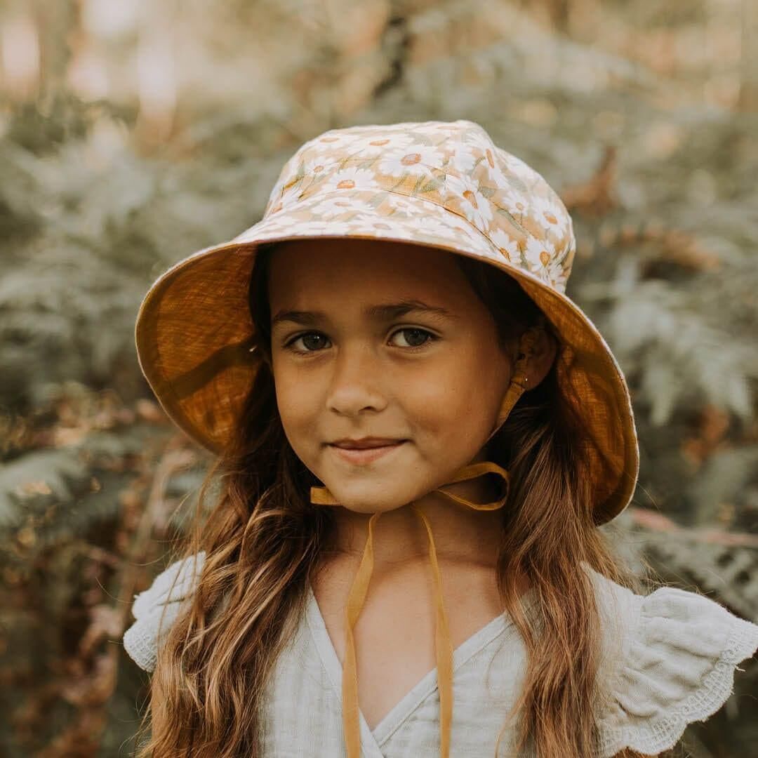 Shapely and stylish with a deep panelled crown, our girl?s bucket hats are light and cool on heads, making them hats kids don?t even realise they?re wearing! Made from 100% eco-friendly linen which can self-cool in summer and warm in winter, the Wanderer hat provides UPF50+ sun protection without overheating heads. The wide brims shield eyes and faces all year round, while the woven interfacing and thin cord edge in the brim gives a little more flexibility and shape without flopping in eyes.