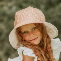 Sweet, simple line drawings of assorted flora pop against the dusky pink backdrop. A reverse of Flax matching the illustrations keeps it breezy and beautiful. Freya is available in Ruffle Bonnet, Flap Hat, Paneled Bucket, Wide-Brim Bonnet, Ladies Wide-Brim Visor, Adults Frayed Bucket and Ladies Sun Hat.
