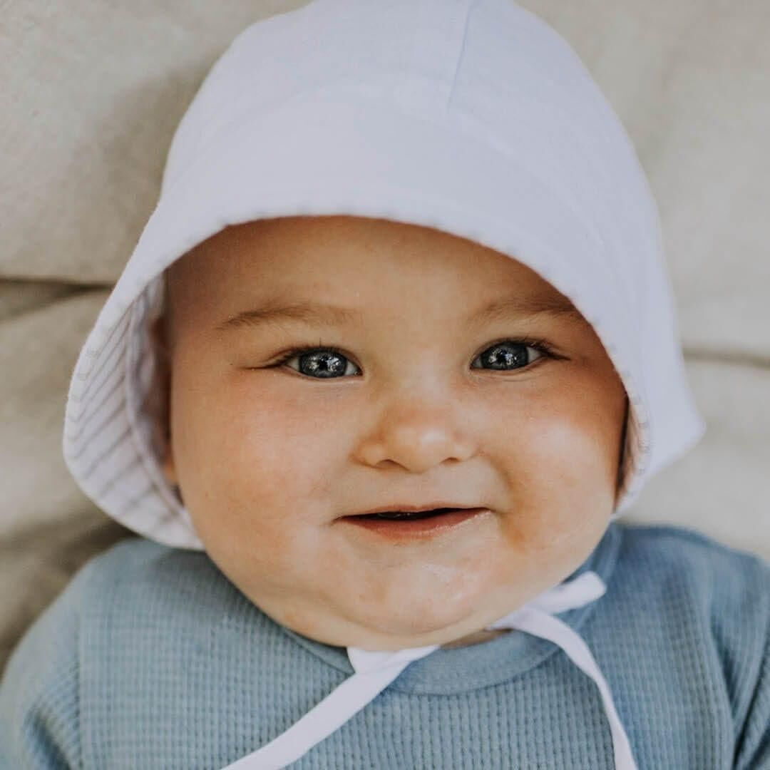 Fully reversible with a pattern on one side and a coordinating solid colour on the other, you get two hats for the price of one. Elasticised chin ties pull the bonnet around a child?s face offering protection (and adorableness!) and can be tied under the chin. The elastic in the ties allow stretch and comfort and ensures ties aren?t too tight.