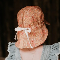 All the autumny goodness in this hat: pinky peach flowers on a burnt orange backdrop. The Flax reverse is a simple neutral perfect for all tastes. Alice is available in Flap Hat, Bonnet, Panelled Bucket and Ladies Sun Hat.