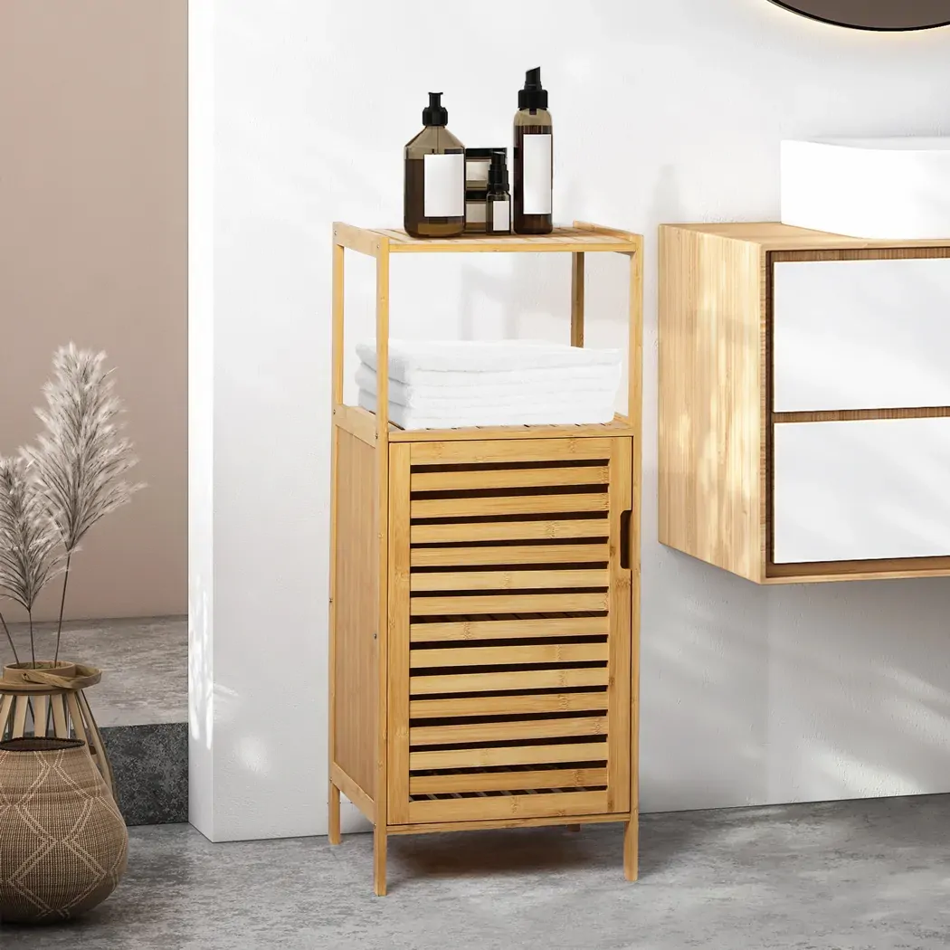 The floor storage cabinet is made of high-quality bamboo and has the characteristic of waterproof. At the same time, the storage cabinets with shelf is light enough to be moved effortlessly by one person. You can easily store slippers, tissues, towels or decorative plants all in the sturdy shelf.