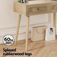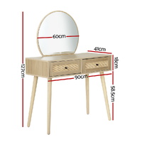 Complete your morning routine with the Artiss Frances Dressing Table. Made from 15mm thick particle board with a smooth melamine finish, real rattan drawers and solid rubberwood legs, the dressing table is designed to last through many early mornings and late evenings. With two generous storage drawers, you can fit all of your make-up, accessories and other health and beauty essentials. The anti-rust drawer runners ensure smooth opening every time. Splayed rubberwood legs keep the table stable and contribute to the generous 60kg weight capacity. The round mirror allows you to get up close and personal for skincare and makeup application and a full view of your ensemble when you're done. With the Artiss Frances Dressing Table, you'll always be ready for what the day brings.