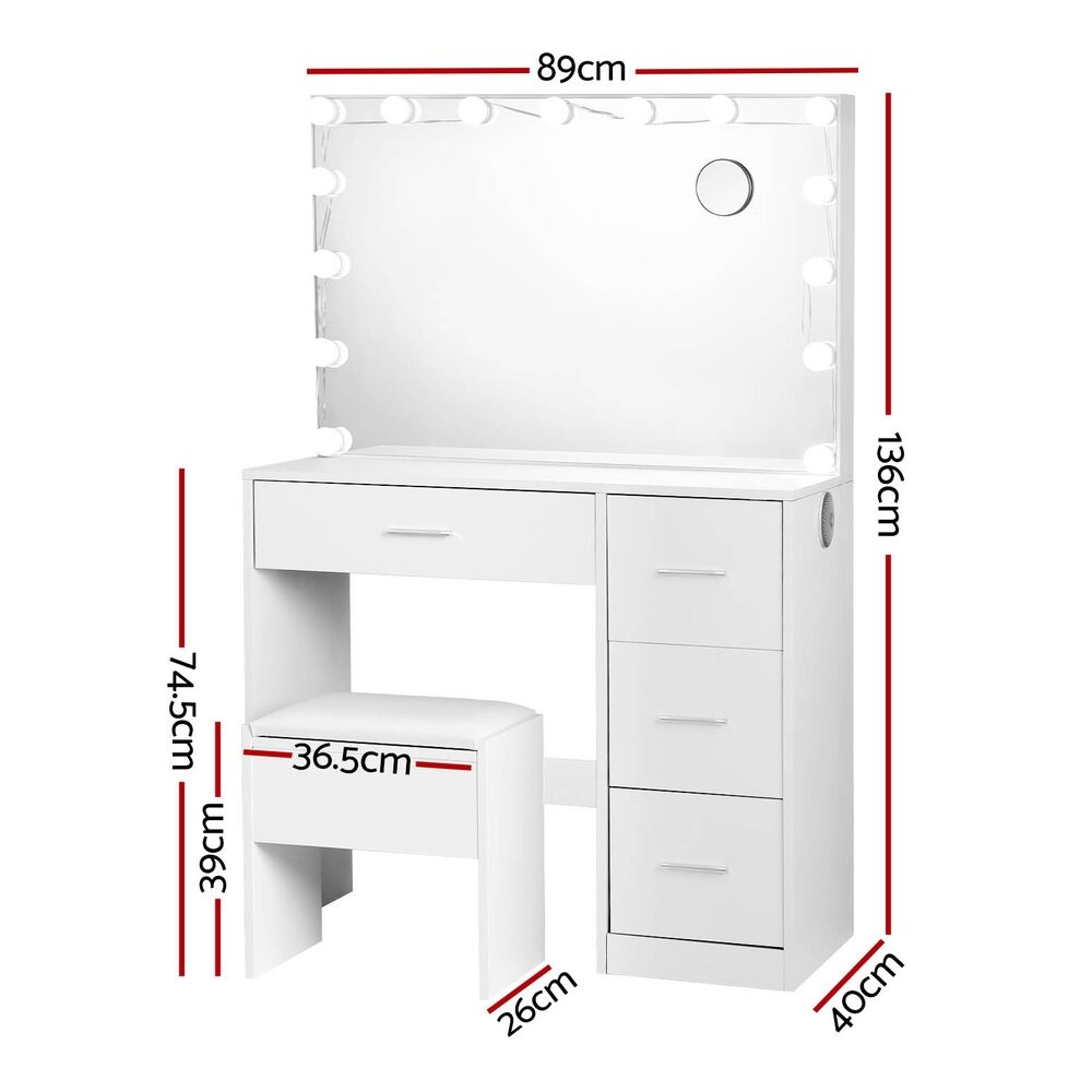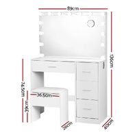 Feel like a star straight out of Hollywood with the Artiss Darcy Dressing Table. Packed with generous storage and other convenient features, your new beauty routine will be a breeze. Made from quality MDF particleboard with a melamine finish, the table is built to last. The Hollywood-style makeup mirror is surrounded by bright LED bulbs for the perfect illumination. Choose from warm, neutral and daylight white light so you can always look stage-ready. The vanity features four generous storage drawers with silver handles open smoothly on anti-rust runners, giving you instant access to your beauty essentials. A foam-padded PU leather stool allows you to sit comfortably while applying make-up or skincare and can be neatly tucked away when not in use. Easy to install and even easier to maintain, you'll love getting ready for the day in front of your new Artiss Darcy Dressing Table.