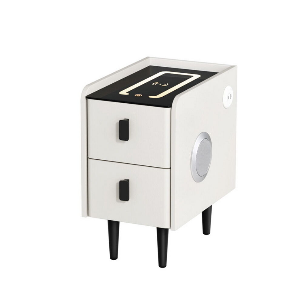 Upgrade your living space with the Artiss Aida Smart Bedside Table, where functionality meets style. This modern table not only lets you charge your phone wirelessly or via USB but also features a built-in Bluetooth speaker for seamless music streaming. Crafted from premium materials, including high-quality MDF upholstered in PU leather and topped with tempered glass, the Aida is as durable as it is stylish. It boasts two spacious drawers with sleek metal handles, perfect for storing your night-time essentials. With both USB and type C charging ports, you can power your devices whether wired or wireless. The adjustable light-up charging panel lets you create the ideal ambience for relaxation. Supported by sturdy metal legs with anti-slip pads, the table stays securely in place while protecting your floors.