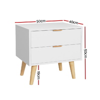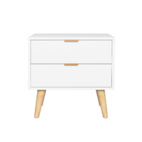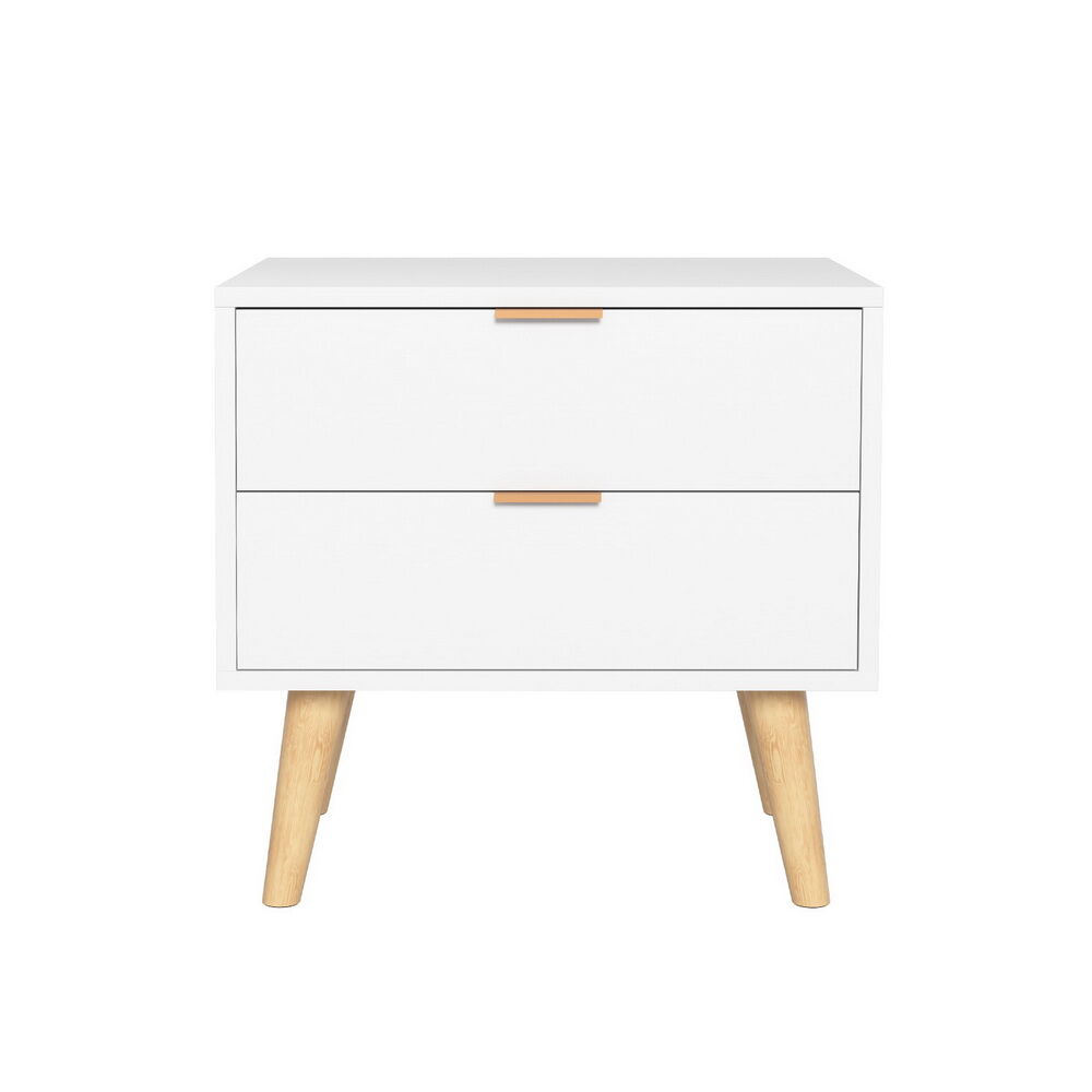Crafted from durable particle board, this Artiss bedside table boasts ample storage with two spacious drawers, adorned with sleek aluminium handles. Supported by sturdy pine wood legs, it's easy to assemble and maintain, complete with floor protectors.