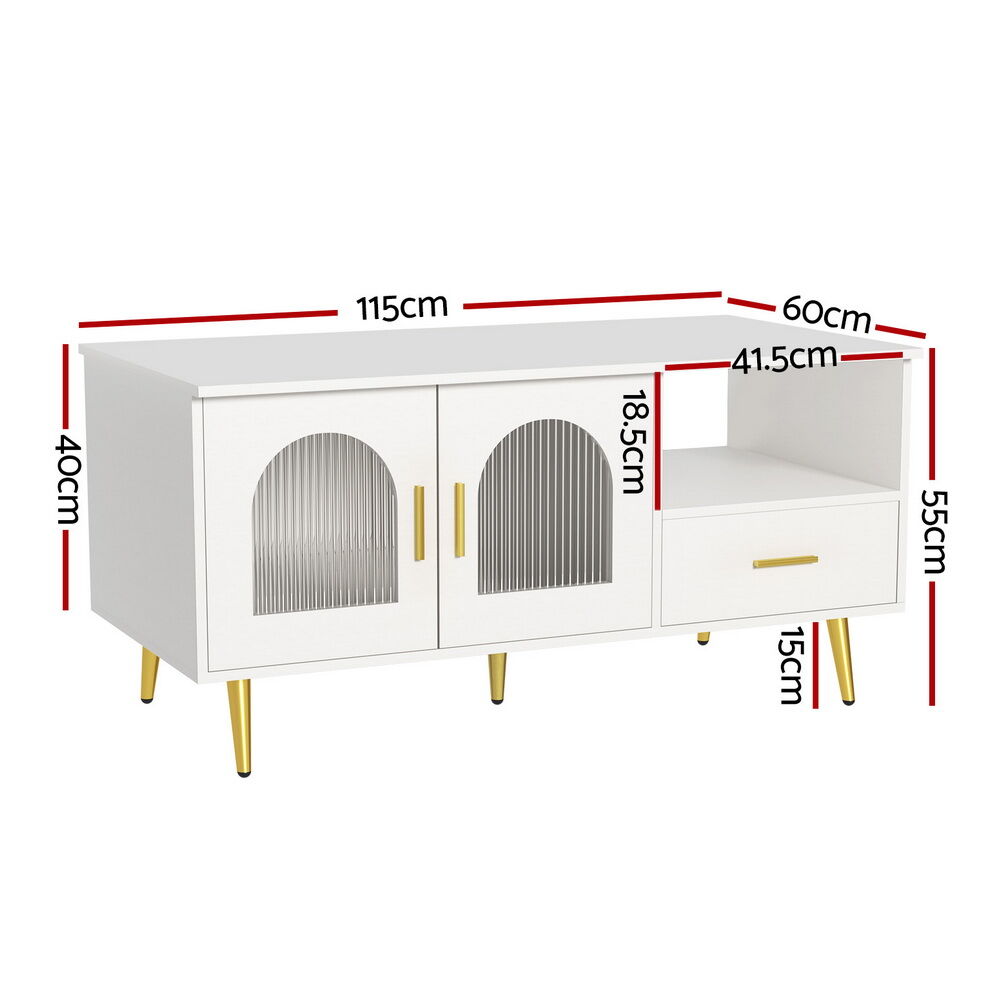 Introducing our contemporary Artiss coffee table with LED strip, USB connectivity, ample storage, sleek metal handles, melamine-coated particle board, reeded acrylic glass door, electroplated metal legs, smooth runners, easy maintenance, and assembly. Modern functionality meets stylish design.