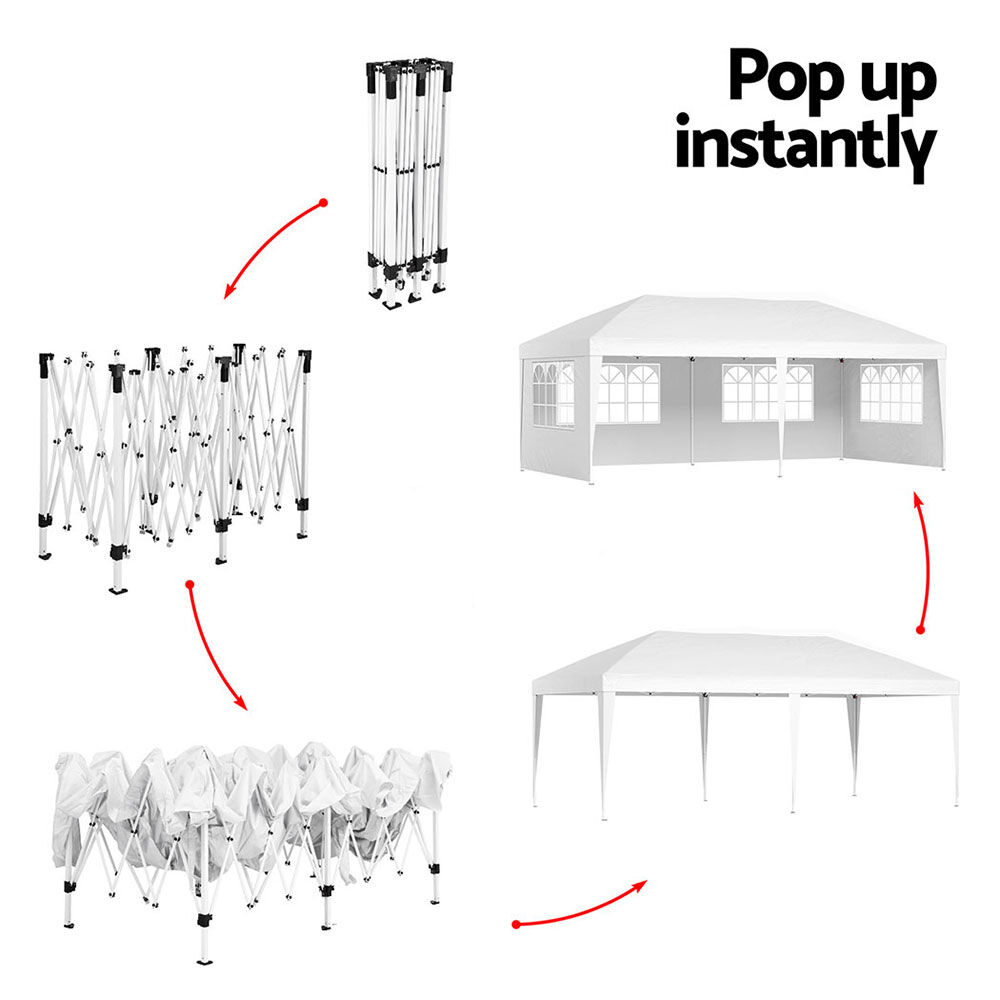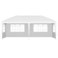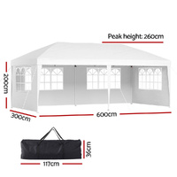 Escape the sun and rain in style with this versatile gazebo! This spacious shelter boasts a generous 300 x 600cm footprint, providing ample shade and coverage for outdoor gatherings. The UV-resistant and waterproof canopy keeps you protected from the elements, while the sturdy legs and struts ensure a stable and secure structure. Quick and convenient Velcro attachments make assembly hassle-free, and the included 4 window panels allow you to enjoy the scenery. All panels are removable and adjustable, allowing you to customize the level of openness. This gazebo is the perfect temporary shelter for various events use it at markets, sporting and school events, camping trips, and trade shows. It even comes with a bonus carry bag for easy transport, along with ropes and pegs to secure it in place. Enjoy the outdoors comfortably and conveniently with this feature-packed and versatile gazebo!