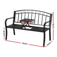 Experience the perfect blend of style and functionality with the Gardeon Multifunctional Garden Bench. This modern rustic outdoor seating solution boasts strong black steel construction, featuring an impeccable weather-resistant finish that ensures durability in various outdoor conditions. The bench's smooth, easy-to-clean surface and curved edges not only enhance its aesthetic appeal but also provide comfort for up to three people. The design includes a hidden center table that can be raised, transforming the three-seater into a cozy two-seater with a convenient surface for afternoon tea, drinks, or snacks.