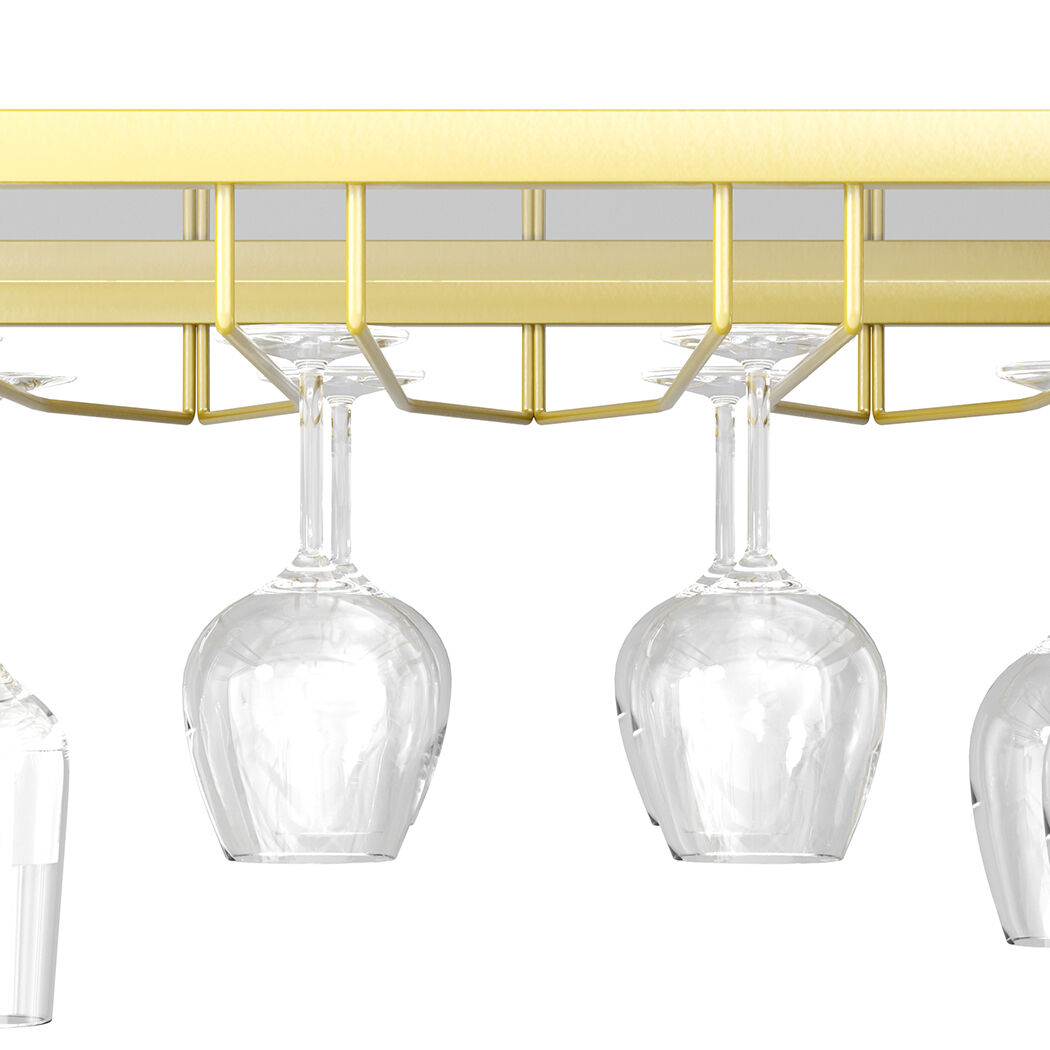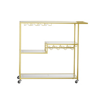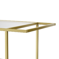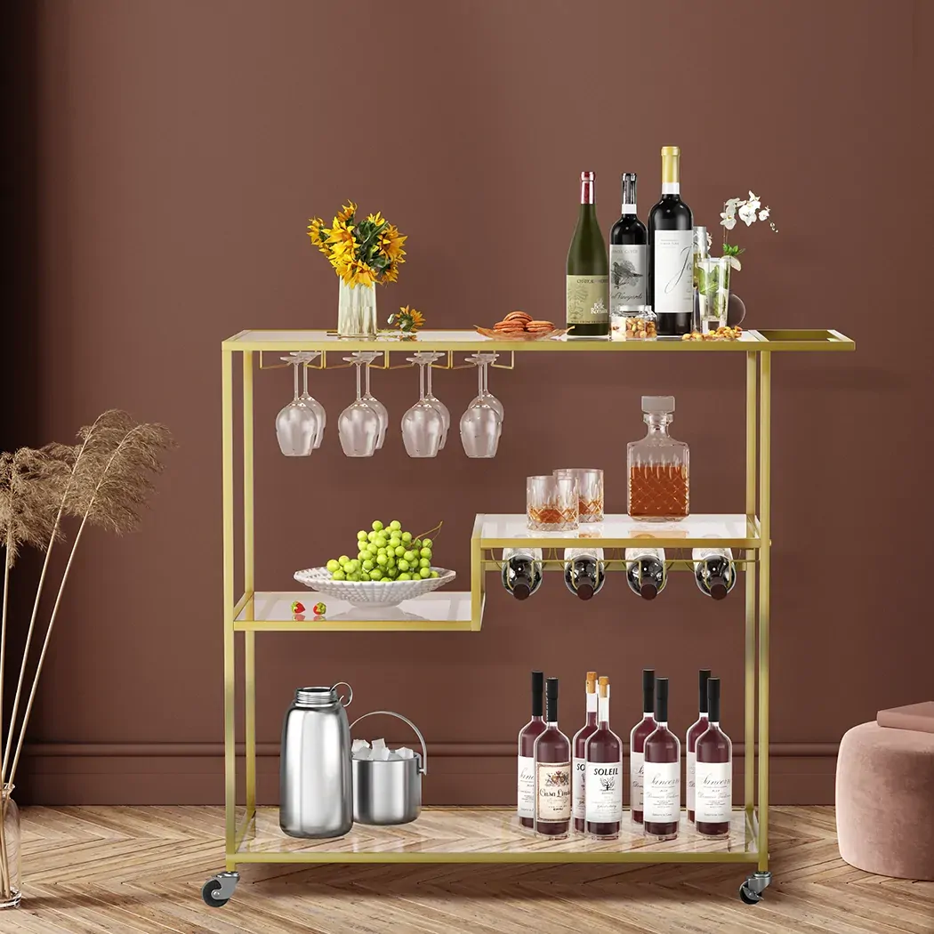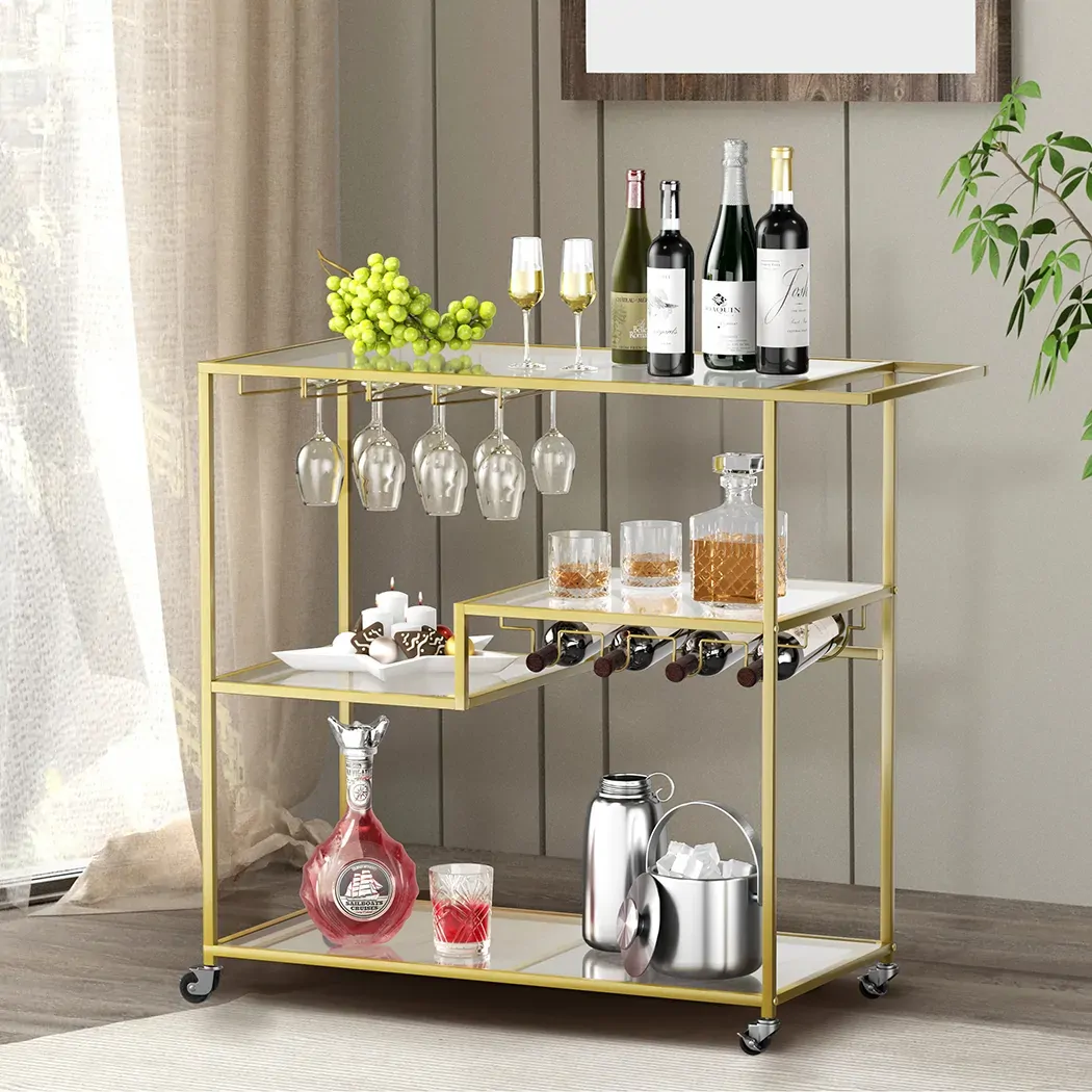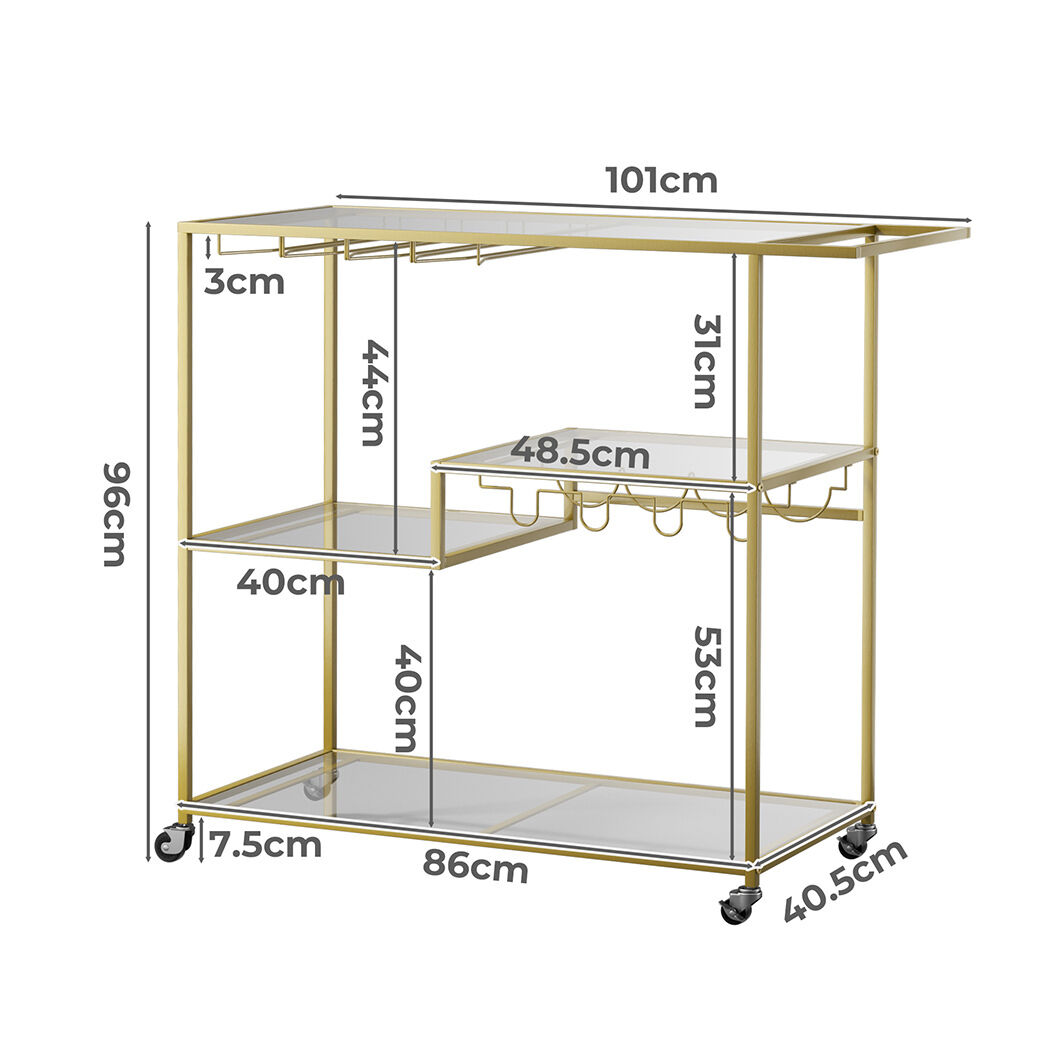 A charming decor addition to your home. Your new stylish gold bar cart makes a great statement at your next party. Clear glass shelves for visibility. Champagne gold powder coated steel looks good and is durable.