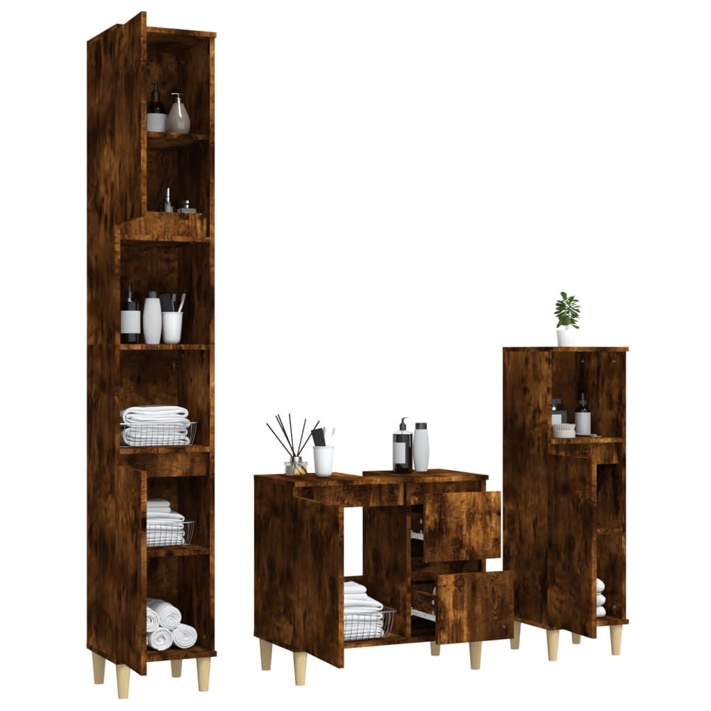 This attractive bathroom cabinet set, with ample storage space, features a stylish yet practical design. Durable material: The engineered wood is of exceptional quality with a smooth surface and features strength, stability and resistance to moisture. Ample storage space: The storage space makes this bathroom furniture set easy to keep things organised. Wooden feet: The solid eucalyptus wood feet give the bathroom vanity unit a natural and pleasant look while ensuring stability.Easy-to-clean surface: The bathroom unit is easy to clean with a damp cloth.Stylish design: The clean lines and sleek design blend into your bathroom perfectly. Warning:To prevent it being overturned, this product must be used with the provided wall attachment device. Good to know:Screws and plugs for inside the wall are not included. We advise to find and use screws and plugs suitable specifically for your walls. If you're not sure, you can consult with a professional. Please read and follow each step of the instructions.