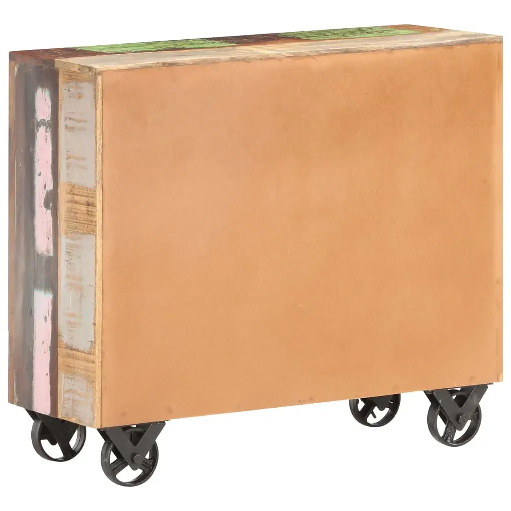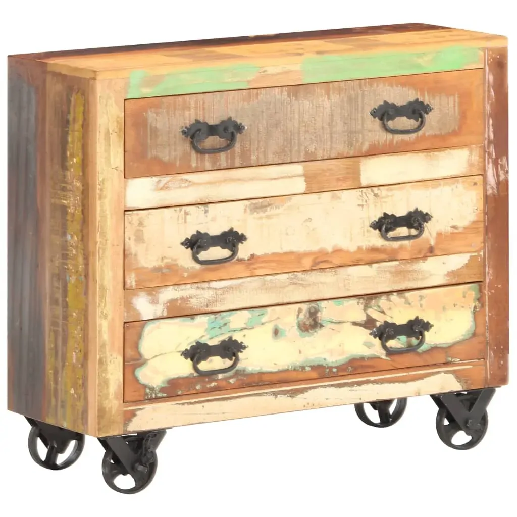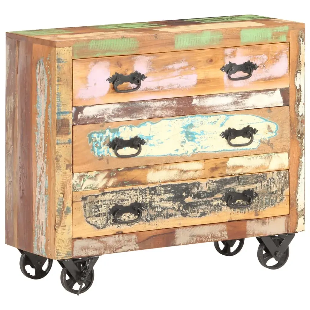 Equipped with 3 drawers, our vintage-style wooden sideboard not only acts as a striking decoration in your interior, but also offers ample storage space to maintain your items in great order. This side cabinet is made of solid reclaimed wood, which means it has the characteristics of different woods like pinewood, teak, oak, mango wood, acacia, etc. Reclaimed wood is already aged, weathered and dried so that it doesn't shrink or bend. Signs of wear and delicate wood grains make every piece slightly different from each other. Every step of the process is carried out with the greatest care, be it polishing, painting or lacquering. Additionally, you can move the storage cabinet easily with its featured 4 cast iron wheels. Important note: The colour may vary from piece to piece, making each of our drawer cabinets unique.