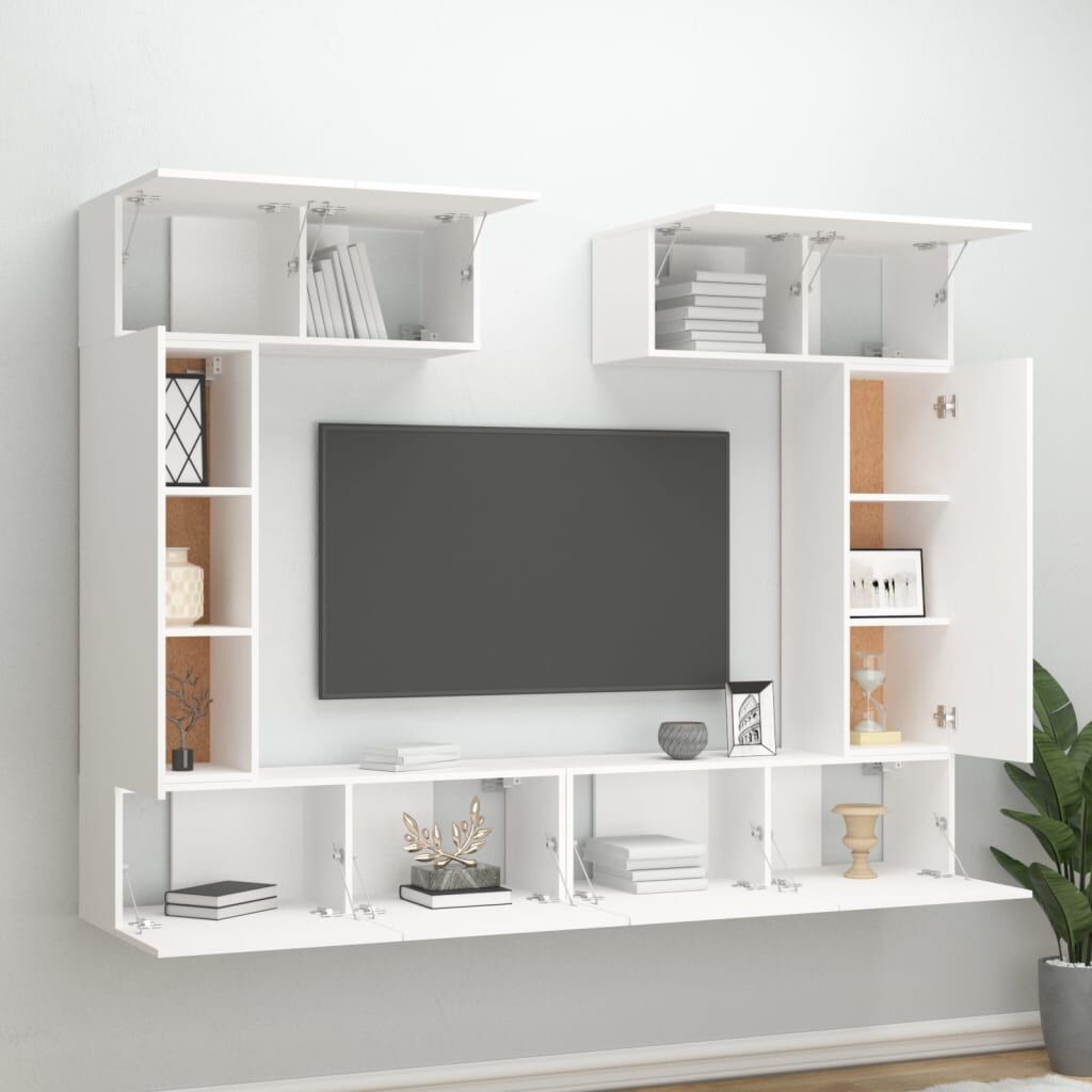 This classic TV cabinet set is designed to be a focal point of your room, featuring a trendy yet practical design. Sturdy material: The engineered wood is of exceptional quality with smooth surface and also features strength, stability and resistance to moisture.Ample storage space: The TV stand set provides ample storage space to keep all your magazines, DVDs and any other items well organised.Wall-mounted design: The TV unit doesn't take any floor space. You can hang it on the wall easily. Note:Screw(s) and plug(s) for inside the wall are not included. Seek and use screw(s) and plug(s) suitable for your walls. If you are uncertain, seek professional advice. Read and follow each step of the instruction carefully.Each product comes with an assembly manual in the box for easy assembly.