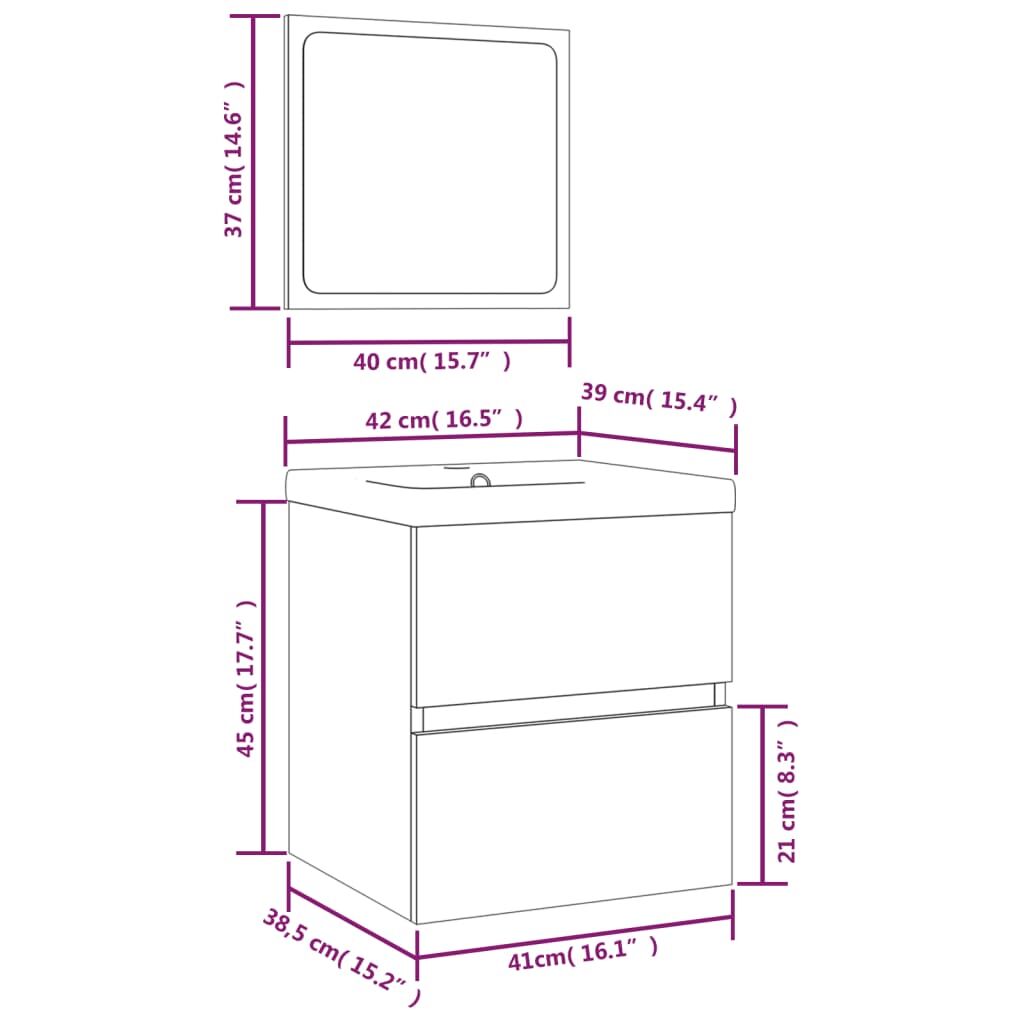 This bathroom sink cabinet with a built-in basin and mirror, featuring spacious storage space, is a chic and timeless addition to any bathroom or washroom. Sturdy material: The under sink cabinet is made of engineered wood, that is of exceptional quality with smooth surface and also features strength, stability and resistance to moisture.Ample storage: The bathroom sink unit features a drawer, offering ample storage space to store items in your bathroom.Practical design: The top of this bathroom cabinet is ideal for placing the sink.Wall-mounted function: The bathroom cabinet and the make up mirror can be wall-mounted to add extra storage space. That way, you can maximise your floor space and keep the area clean.Overflow function: An overflow is also equipped to flow water out when it gets too full. Note:Screw(s) and plug(s) for inside the wall are not included. Seek and use screw(s) and plug(s) suitable for your walls. If you are uncertain, seek professional advice. Read and follow each step of the instruction carefully.The tap and the drain are not included in delivery.Each product comes with an assembly manual in the box for easy assembly.