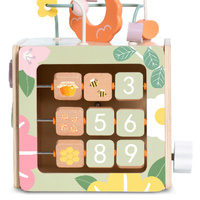 It's honey bee themed multi-functional activity cube that includes a bead maze, spinner, flip number card, slide rails and shape sorter. Children will enjoy exploring the world of garden. It will help develop their multi-sensory and etc.