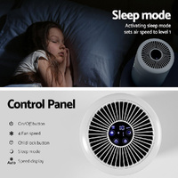 Enjoy cleaner, fresher air with the Devanti Air Purifier. With a CADR of 130m/h, it efficiently purifies air in rooms of various sizes. The H-11 grade HEPA filter captures up to 99.97% of airborne particles, while the activated carbon filter removes odours and harmful gases. The easy-to-use touch control panel lets you adjust four fan speeds, activate sleep mode, and lock the controls for safety. It operates quietly with a three-layer filtration system, making it ideal for day or night use. The air quality indicator shows real-time updates with three colour displays, so you always know the quality of your air.