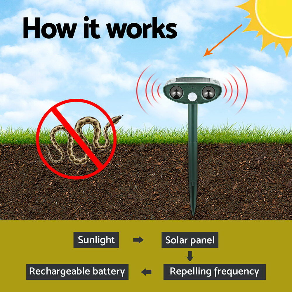 Our Solar powered Snake Repellers keep snakes out of your area without harming them by emitting strong ultrasonic.You can easily set up multiple repellers to provide a barrier around your house. They are also portable to bring along to camping trips for peace of mind. Suitable for your garden, yard, farm and orchard, It can be inserted in ground .