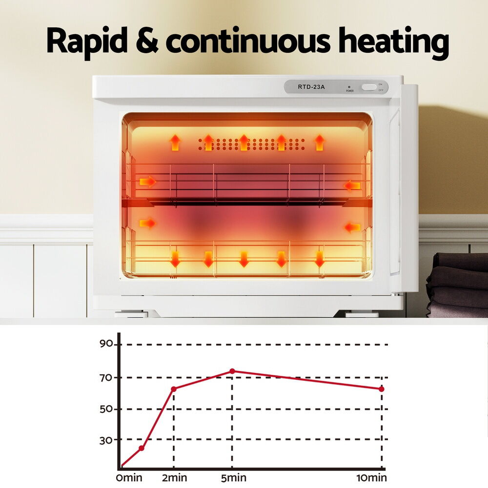 The 23L capacity towel warmer is perfect for drying towels, clothes, and blankets. The constant temperature of 60-61 °C is maintained, making it a great addition to your Spa, Salon, Home, and Hotel. With a quick heat-up time of 5 minutes, the control button and removable basket make it easier to use. The well double-walled insulated design ensures greater efficiency, while also being mildew-resistant. The removable basket and one-button control make it simple to use. Australian standard plug ensures safe usage. Get this high-quality towel warmer and experience the luxury of warm towels every time!