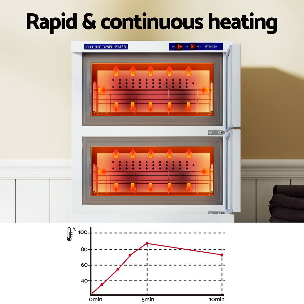 The 32L capacity towel warmer is perfect for drying towels, clothes, and blankets. The constant temperature of 72-74 °C is maintained, making it a great addition to your Spa, Salon, Home, and Hotel. With a quick heat-up time of 5 minutes, the control button and removable basket make it easier to use. The well double-walled insulated design ensures greater efficiency, while also being mildew-resistant. The removable basket and button control make it simple to use. Australian standard plug ensures safe usage. Get this high-quality towel warmer and experience the luxury of warm towels every time!