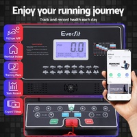 Introducing our premium Everfit treadmill with a robust composite running board and strong powder-coated steel frame. Featuring a user-friendly control panel, clear digital LCD display, high-performance motor, and durable running belt. Enjoy automatic incline, shock absorption, heart rate monitoring, and Bluetooth connectivity.