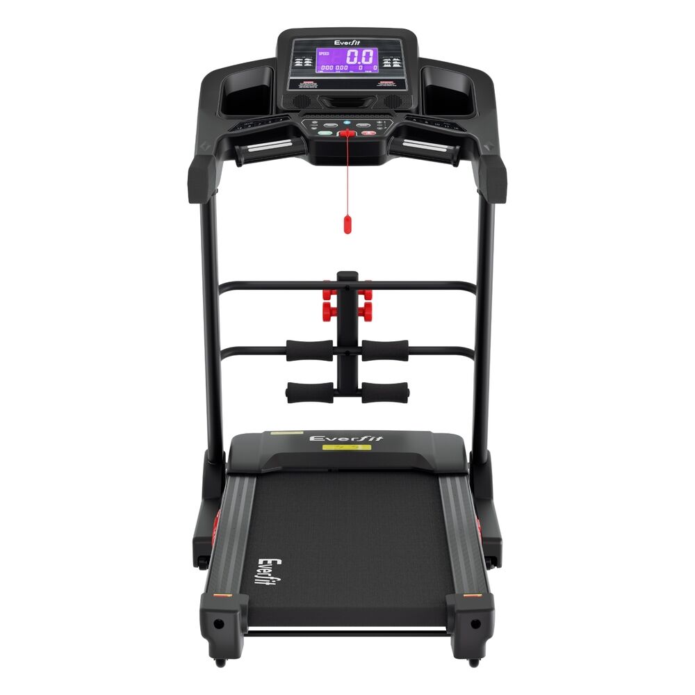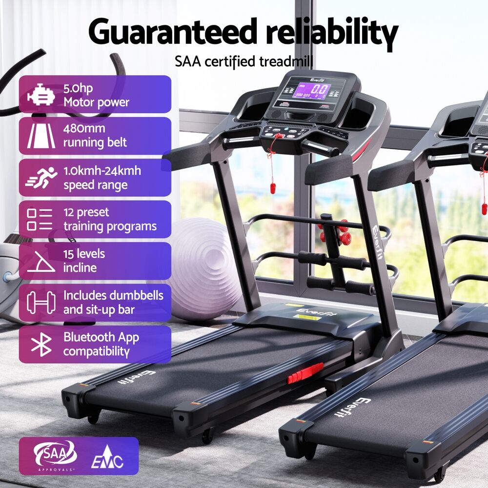 Introducing our premium Everfit treadmill with a robust composite running board and strong powder-coated steel frame. Featuring a user-friendly control panel, clear digital LCD display, high-performance motor, and durable running belt. Enjoy automatic incline, shock absorption, heart rate monitoring, and Bluetooth connectivity.