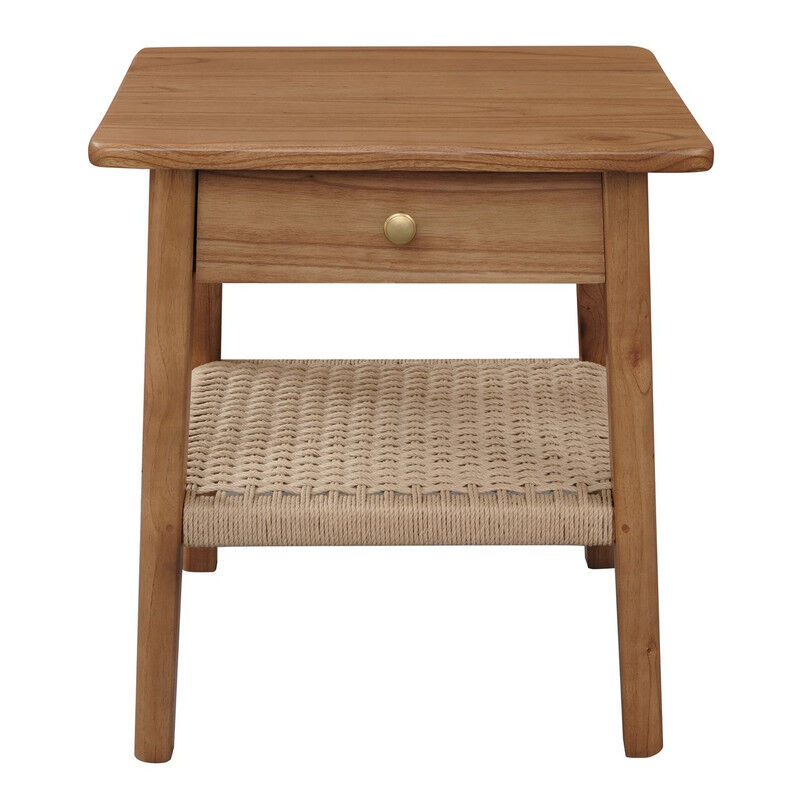 Bring a touch of mid-century style to your space with the Kelly One Drawer Bedside. Made from Solid Mindi timber (White Cedar), this piece showcases the natural beauty of the wood, highlighted by a smooth almond finish that enhances its warm, organic texture. The solid brass handle offers a classic look, while the handwoven loom shelf adds character and provides extra storage. This bedside table comes fully assembled, so it's ready to use right away. With dimensions of WDH: 50.0 x 45.0 x 55.0 cm, this bedside table combines practical design with a style that suits both modern and mid-century-inspired interiors.