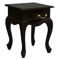 Embrace the sophistication of the Queen Anne 1 Drawer Lamp Tablea piece that pays homage to the elegance of traditional furniture design. Expertly crafted from solid mahogany timber, renowned for its strength and aesthetic appeal, this lamp table is detailed with brass hardware that adds a distinguished touch of luxury. Delivered fully assembled for your convenience, the Queen Anne lamp table measures 45 x 45 x 60 cm, providing an exquisite accent to any space without overwhelming it. Available in a selection of finishesChocolate, Light Pecan, Mahogany, White, and White Carameleach hue is chosen to highlight the natural beauty of the wood and complement your decor. The table's design is inspired by the graceful and romantic forms of the Queen Anne style, characterized by its curved lines and subtle ornamentation. The cabriole legs are a hallmark of the style, lending an air of antique charm and formality. The single drawer offers practical storage, making the table as functional as it is beautiful.