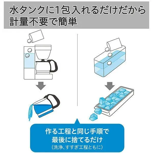 It thoroughly cleans and disinfects dirt in the water supply path of the automatic ice maker. It can also be used in a coffee maker. It is a safe design with 99% food ingredients. (this does not eliminate all bacteria.)