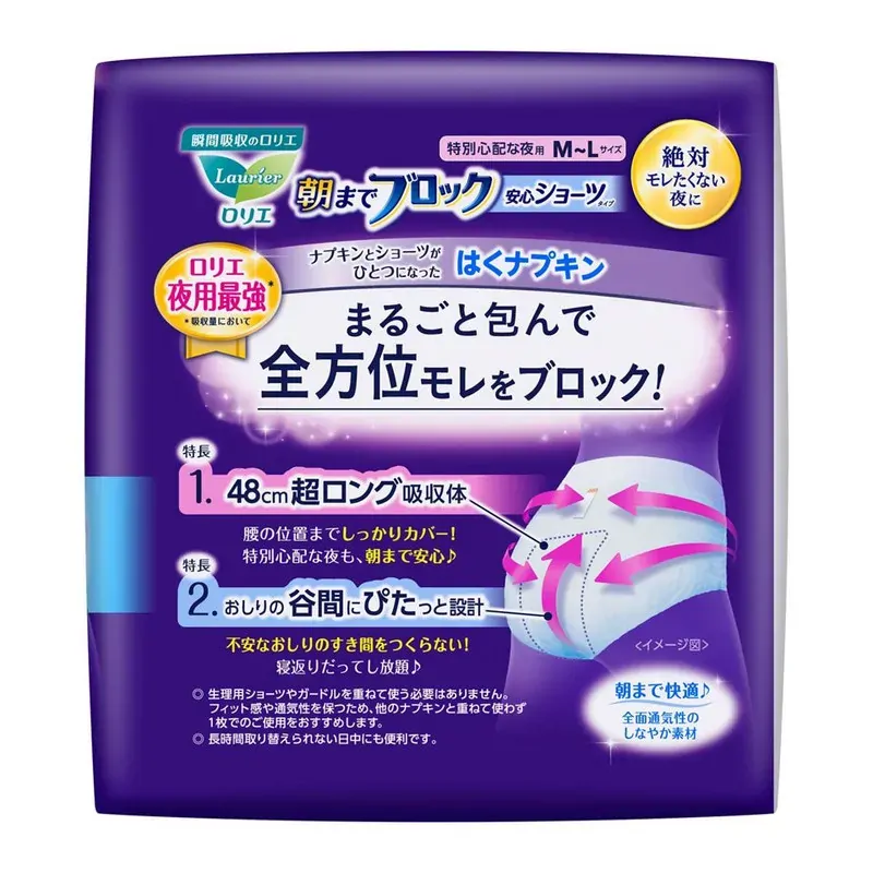 The "haku-napkin", which combines napkin and shorts, wraps the whole body and blocks omens from all directions! 48cm super long absorber covers up to the waist. Even at night when you are worried, it is safe until morning ? in addition, the design of the cleavage of the bottom does not create a gap of anxiety even if you turn over. Laurie night for the strongest absorption power in the napkin. At night when you absolutely don't want to leak out. The "loose L size" with a relaxed waist is also new! (quasi-drug)